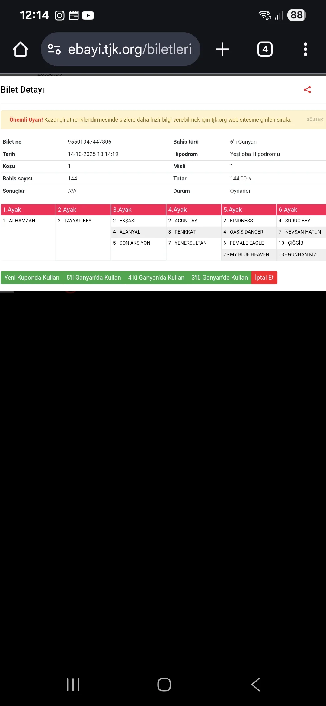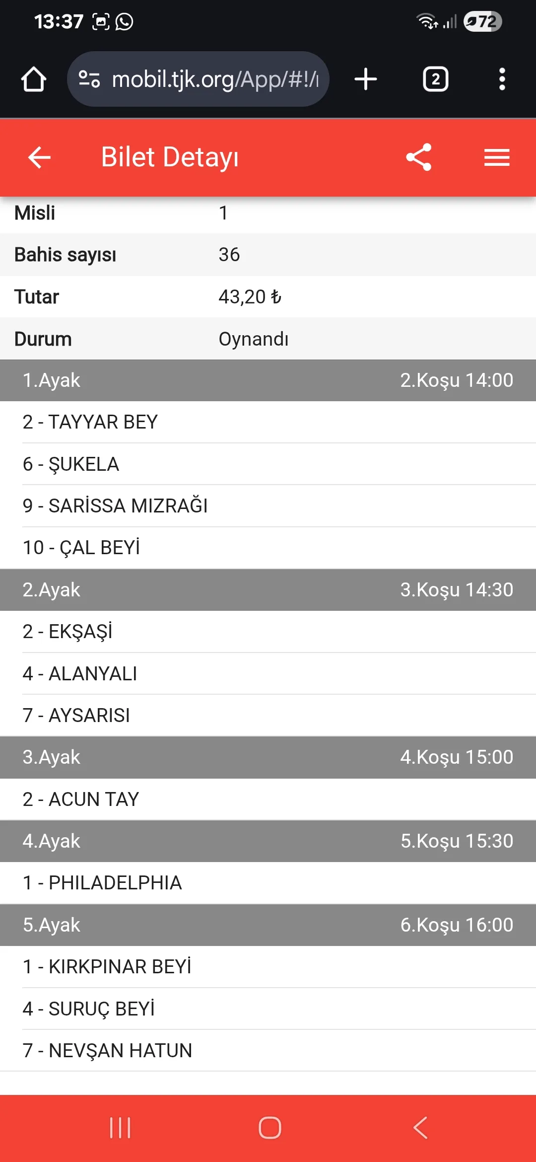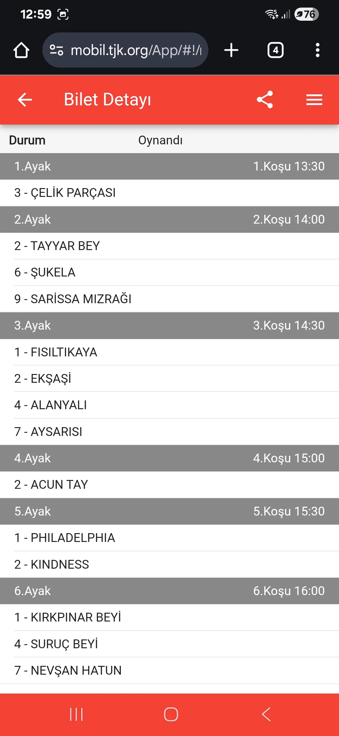 Bilet no 24416295804573 Bahis türü 6’lı Ganyan