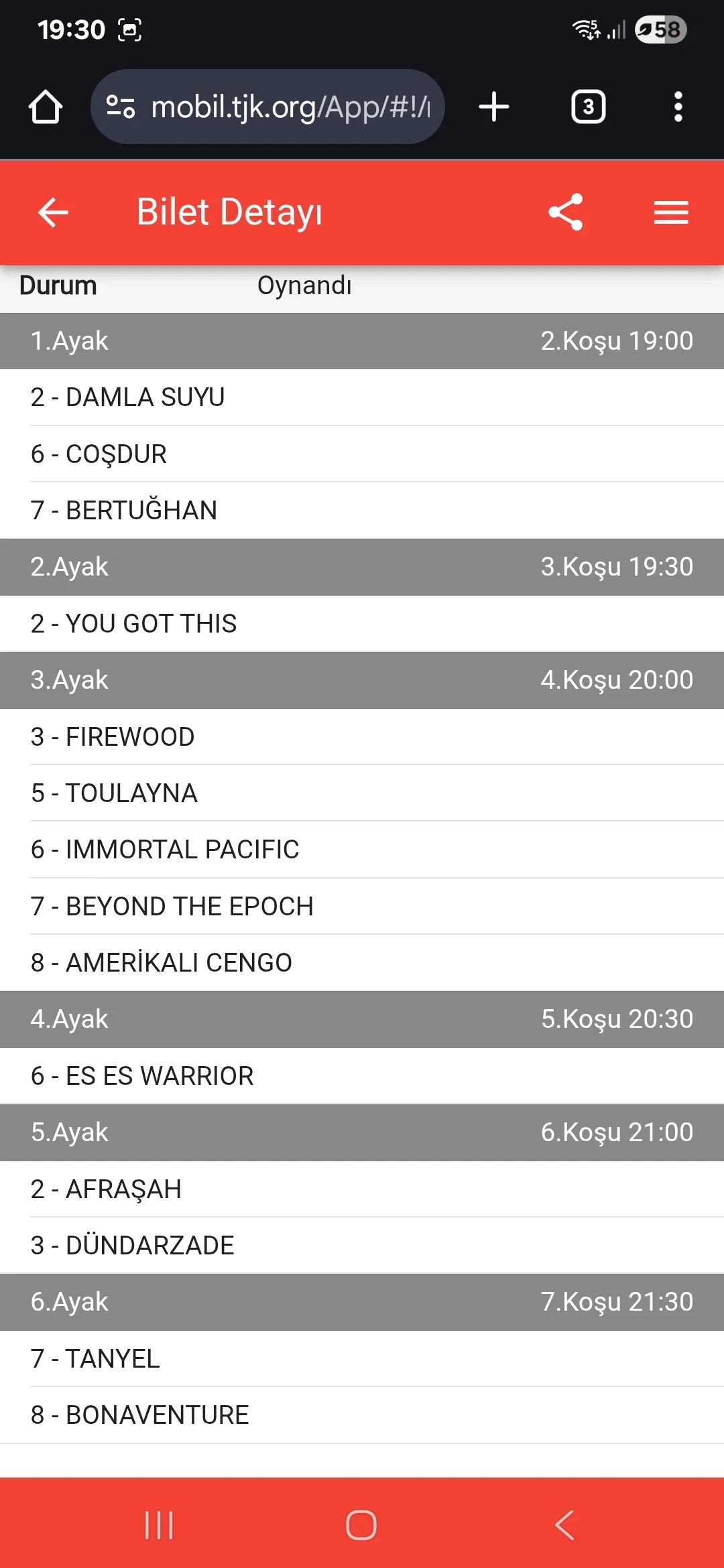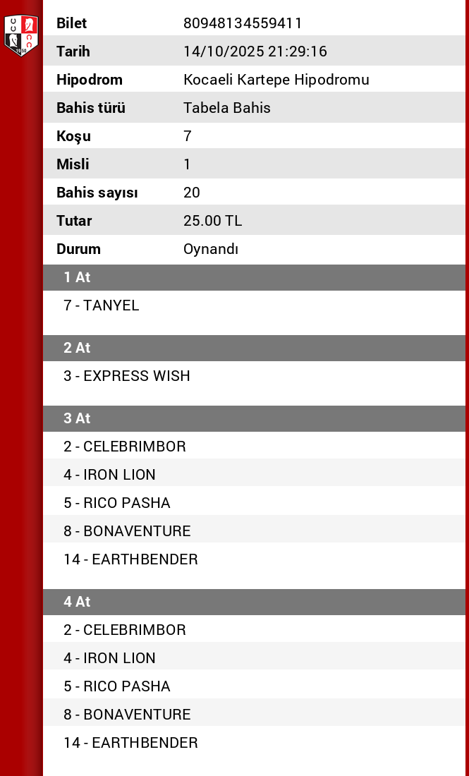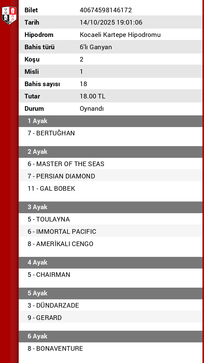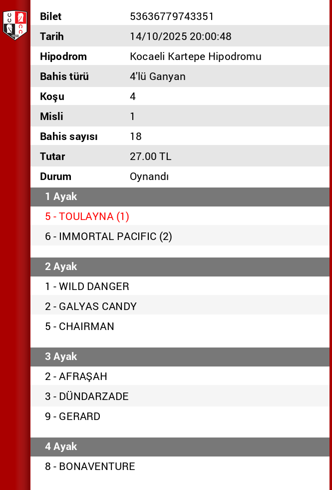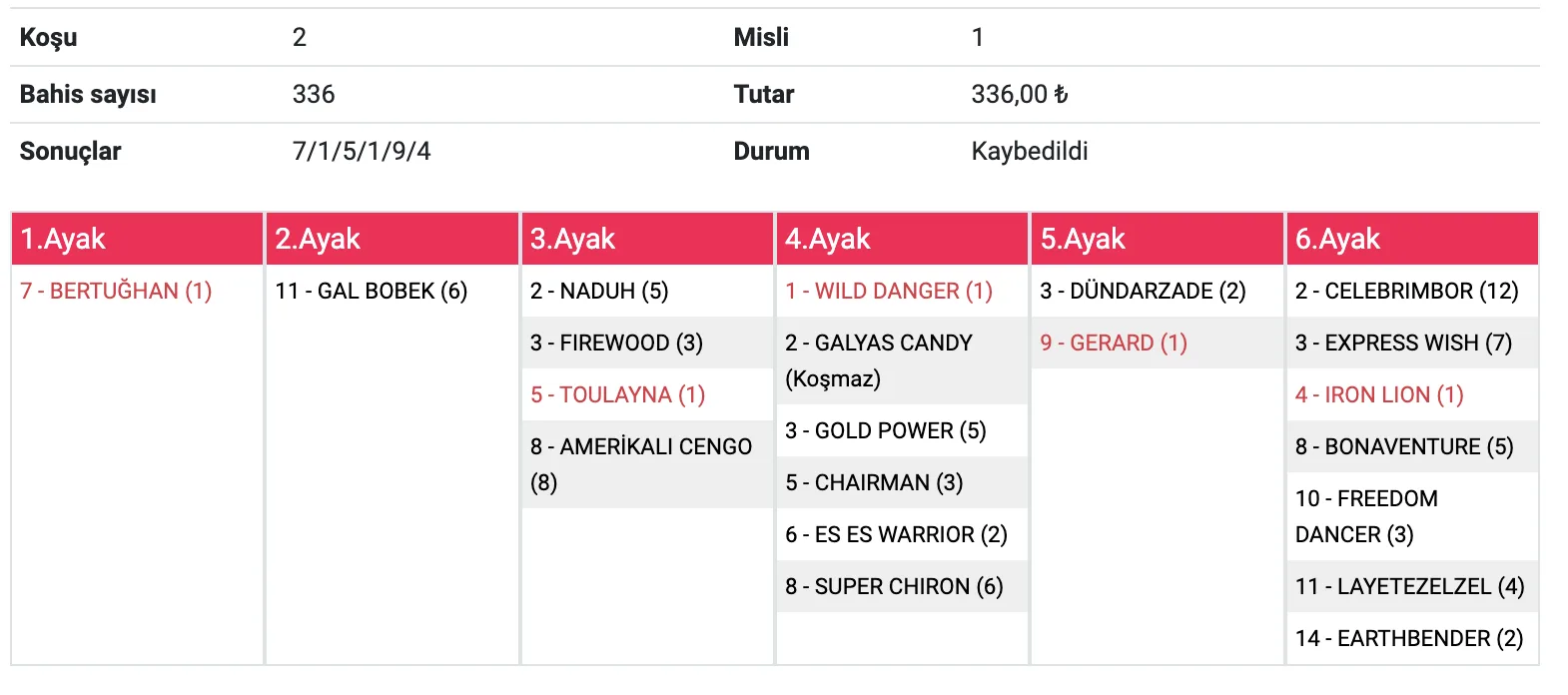 Evet Adminim 2. tek riskli tekti, oturtamadik. 9% civari oynanma orani vardi. Kazanan atin da 18% oynanma orani vardi. Gelse çok daha iyi bir ikramiye ile seytanin bacagini kirardik. Son ayakta da 8’e yuklendik. misli 3’lu ve 4’luler kacti. Yarina artik.