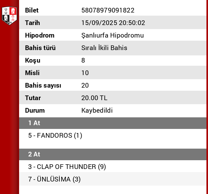 4.KOŞU: 2-SON YAĞIZ seri ikincilikler yaptı , son yarışında arkada bıraktığı isimler arasında iyi rakipler vardı…Bugün İsa Akyavuz’un tekrar tercihi ile net favori…Geçen dönem bu pistte Kent Rüzgarı ,Bay Yakut gibi isimleri geride bırakmışlığı olan 6-RÜZGAR DELEN rakip olarak gördüğüm isim…8-NECMİ BABA aradan sonra bu pistte bir koşu gördü , burada daha etkili olabilir..