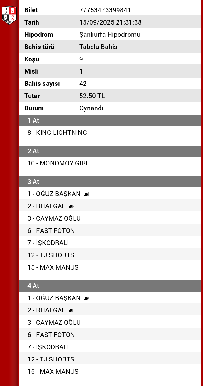 9.KOŞU: 10-MONOMY GIRL ve 8-KING LIGHTING arasındaki mücadeleye 1-OĞUZ BAŞKAN’ın da katılmasını bekliyorum..5-BABA EMRE , 6-FAST FOTON ve 12-TJ SHORTS bu isimlerden sonra….