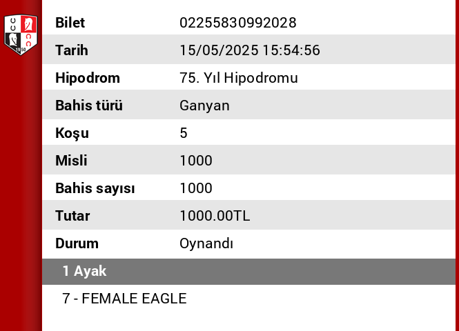 5li yapana, ikili çifte ganyan oyunları yapanlara bir at önereceğim: 7 nu. FEMALE EAGLE…
