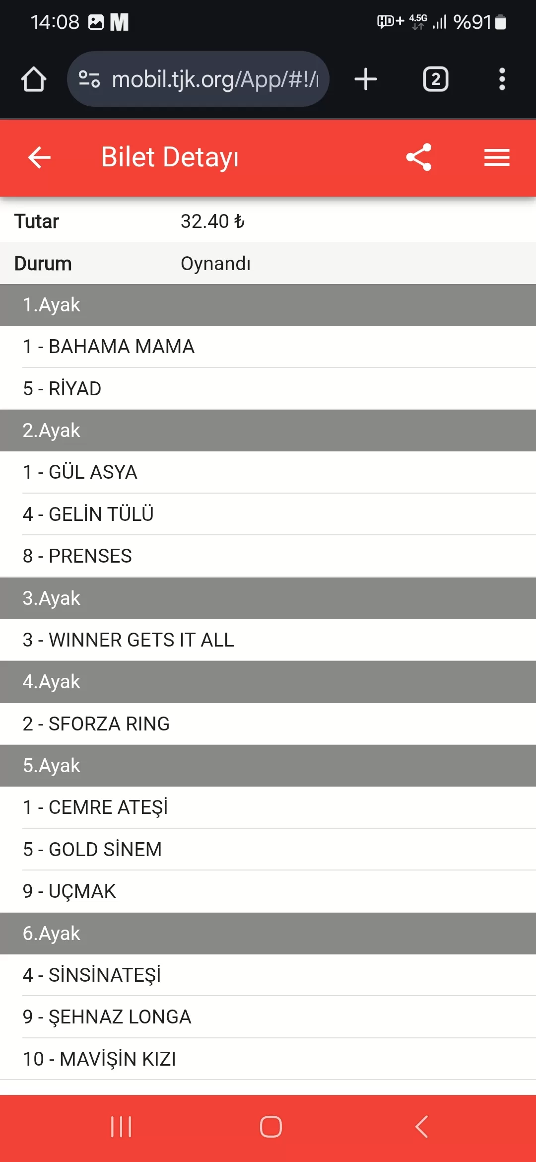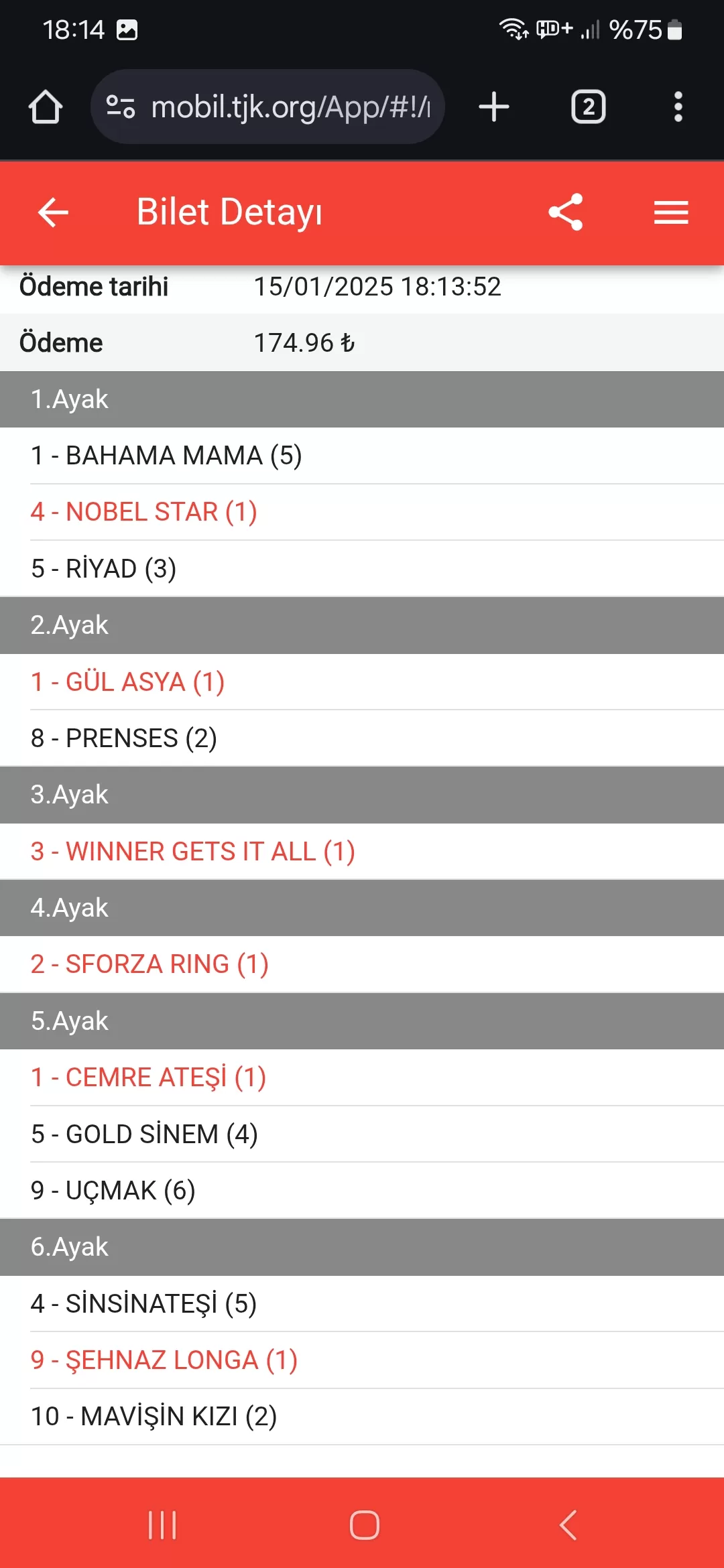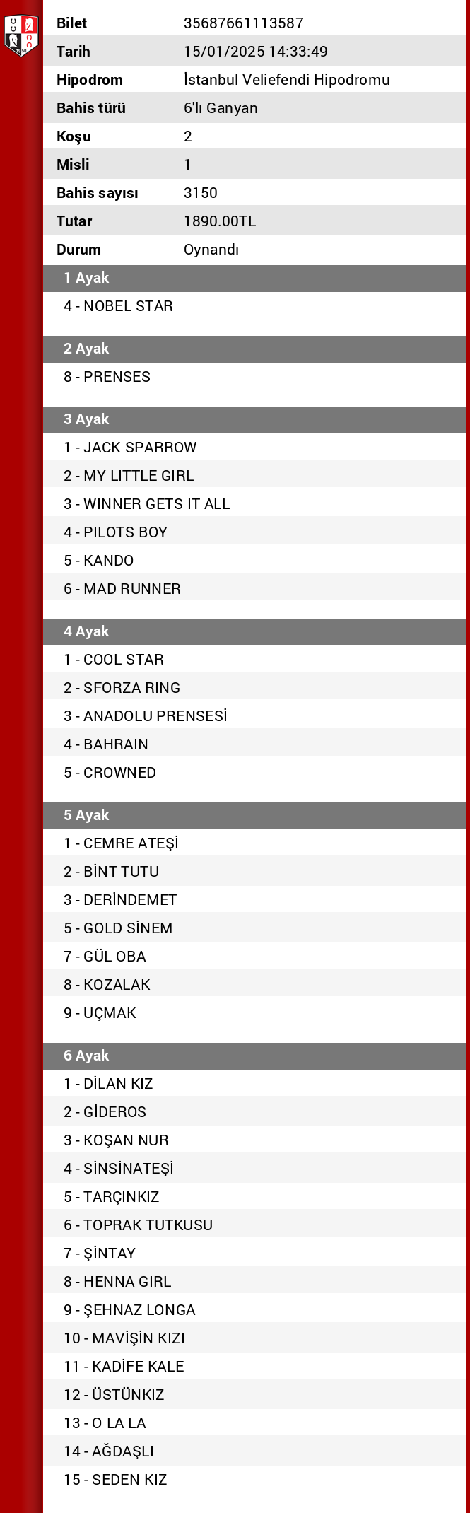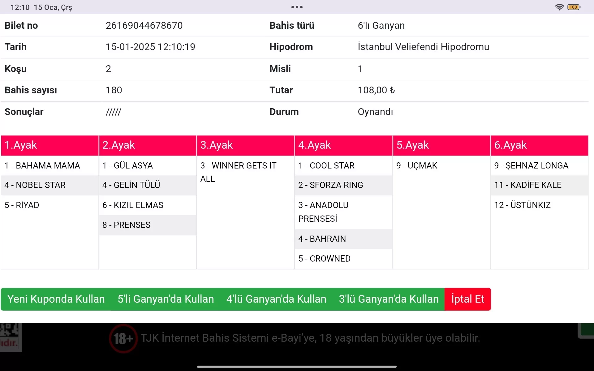 Bilet no 70860082819903 Bahis türü 6’lı Ganyan