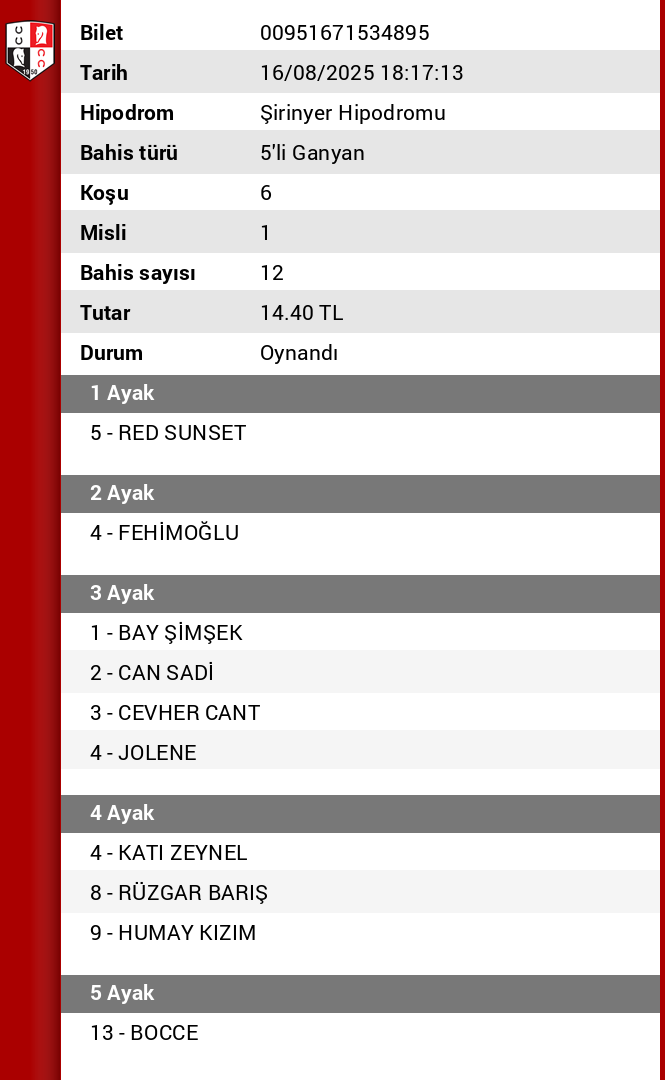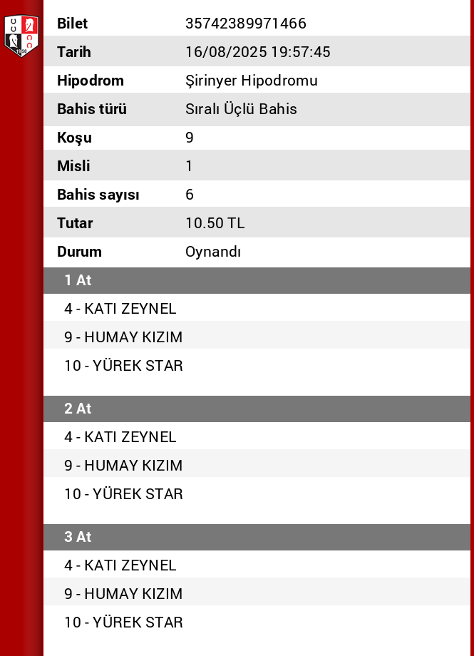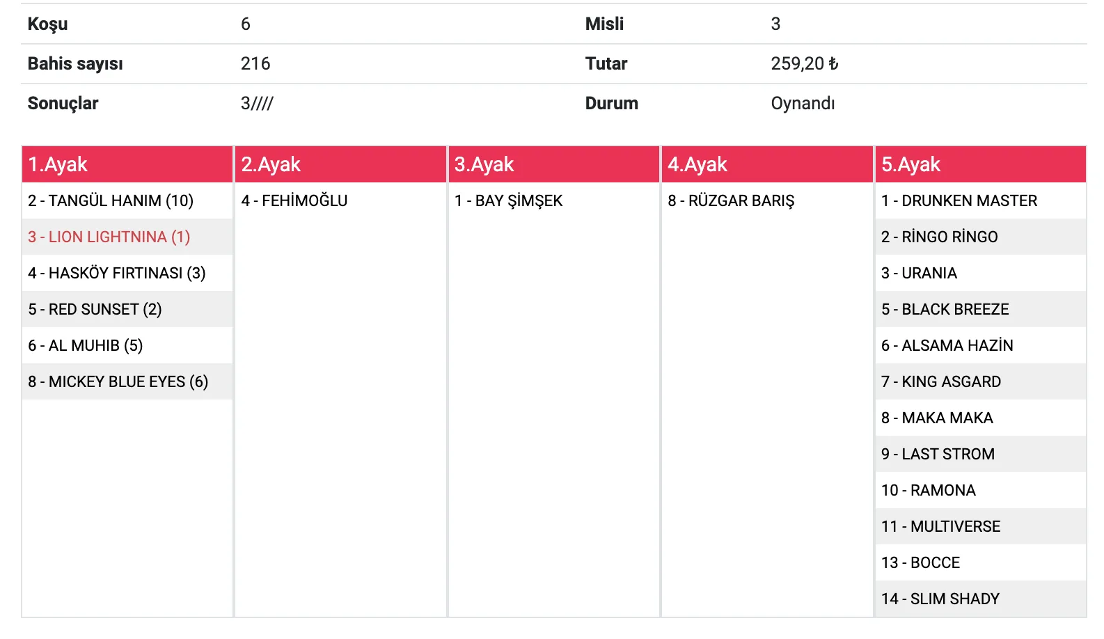 Bahis sayısı 240 Tutar 288,00 ₺