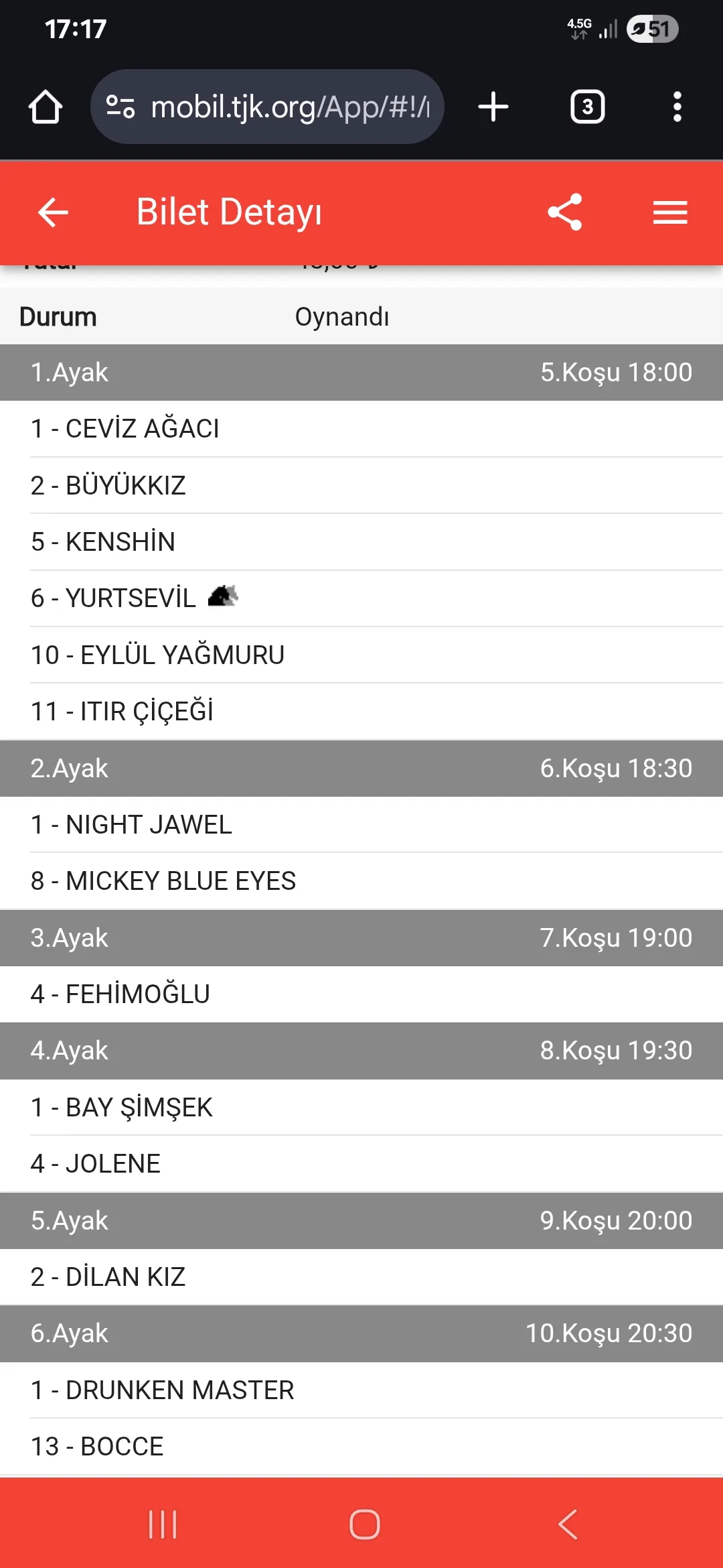 6.KOŞU : 2 TANGÜL HANIM 1 NIGHT JAWEL 4 HASKÖY FIRTINASI 5 RED SUNSET yazılabilecek isimler 9 CAN AYVALIK çok ters bir at bu kadar at yazınca bu safkanı da yazmadan geçmeyelim kazanmadı kazanmadı ters koşarsa günün bombasını patlatır