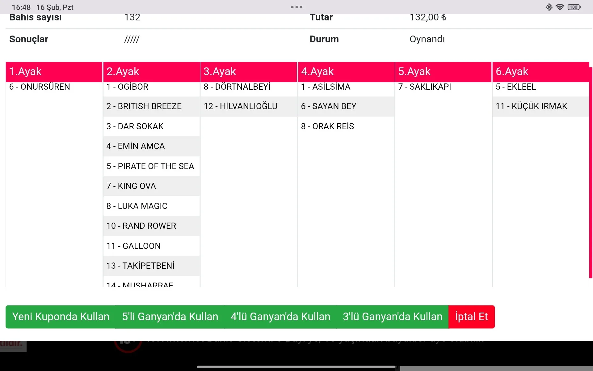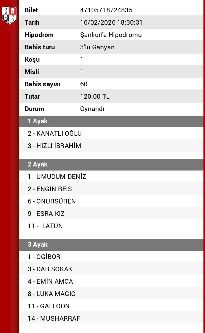 Sanatkar benim birinci atim dı galoplarda yakaladım kuru bir üçlü ganyan la bitirdik sağlık olsun herkese rastgelsin
