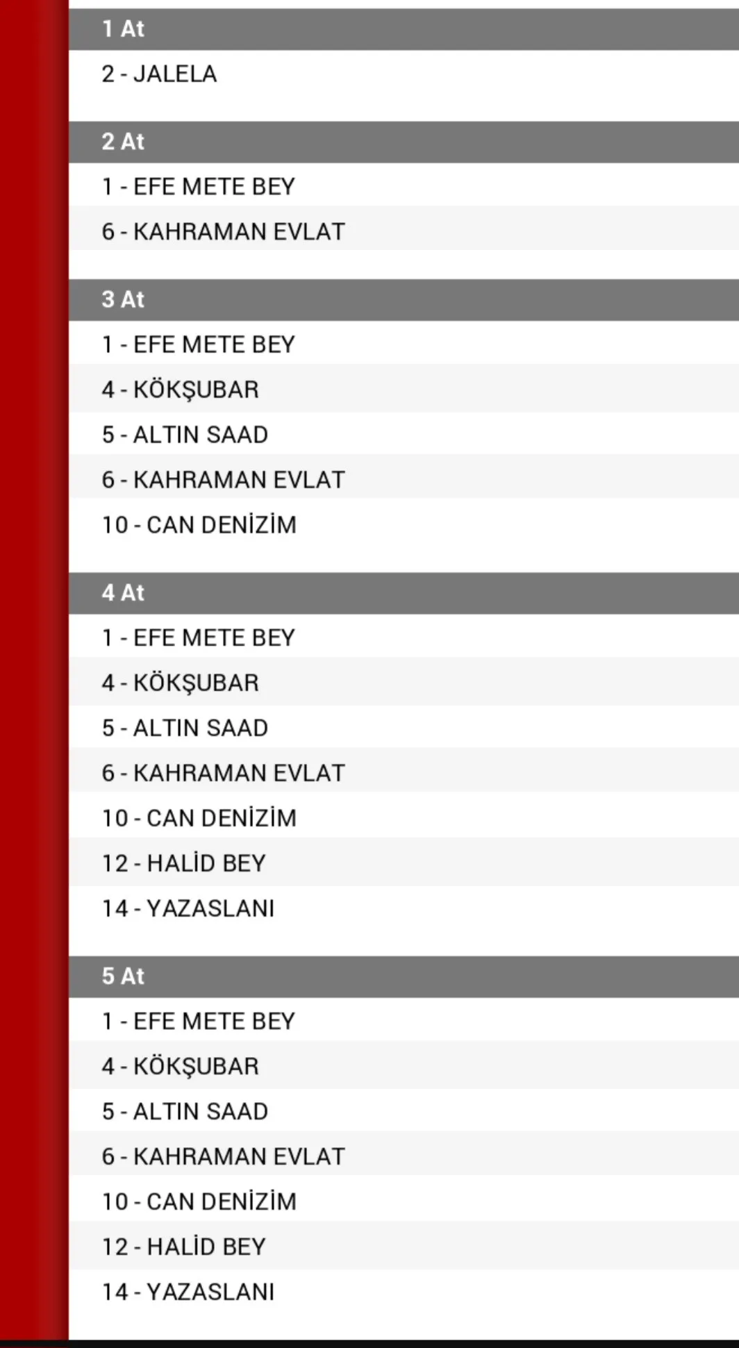 6.AYAK : Takıyı çıkardıktan sonra at son iki yarış çok iyiydi 6 KAHRAMAN EVLAT yarın kazanmaması için bir neden yok 1 EFE METE BEY 4 KÖKŞUBAR rakipleri olacaklar iki tane bomba isim bırakayım 5 ALTIN SAAD ve 10 CAN DENİZİM alakasız isimler ama belli olmaz ters bir yarış çıkarabilirler altılı para yapar