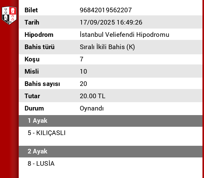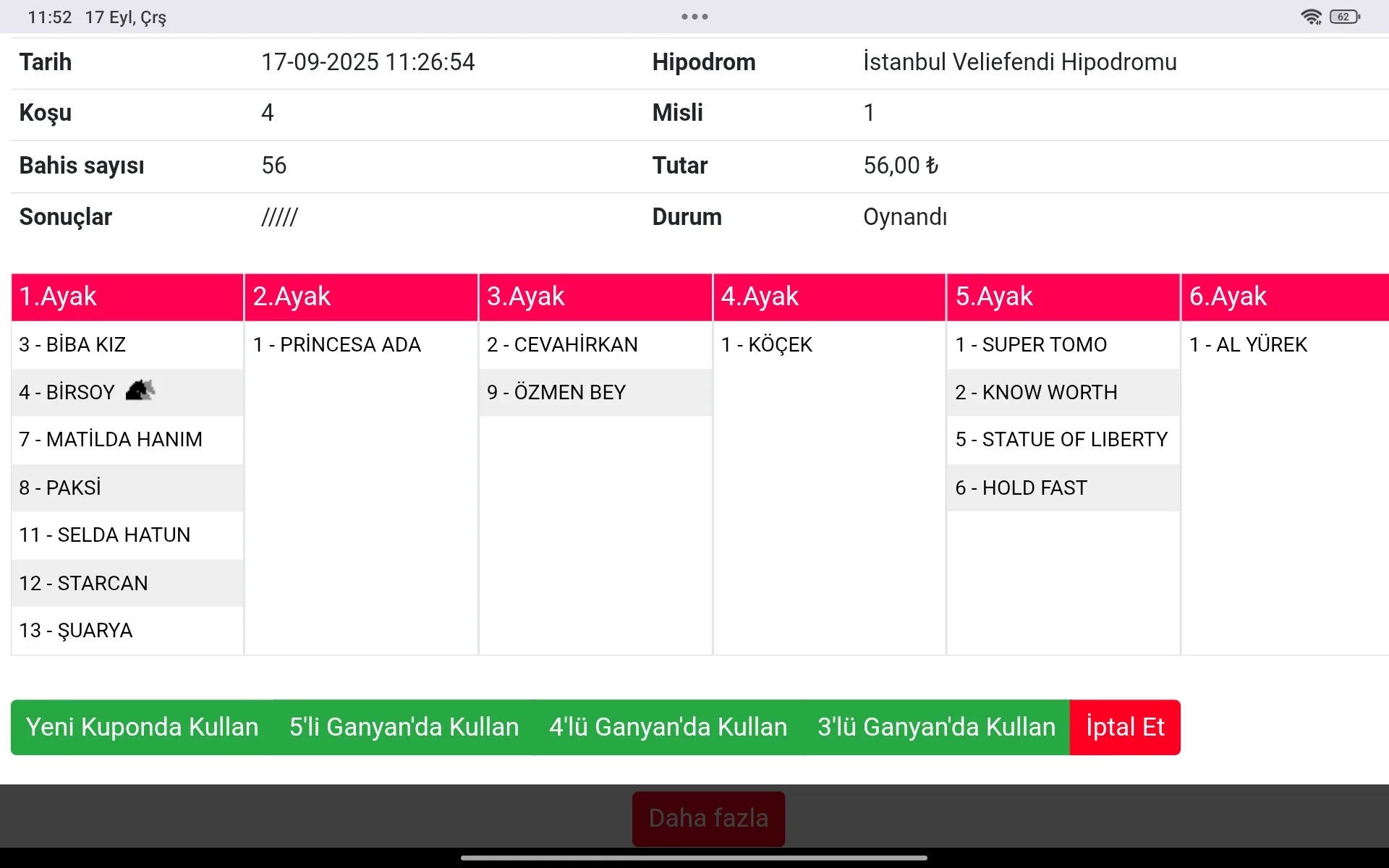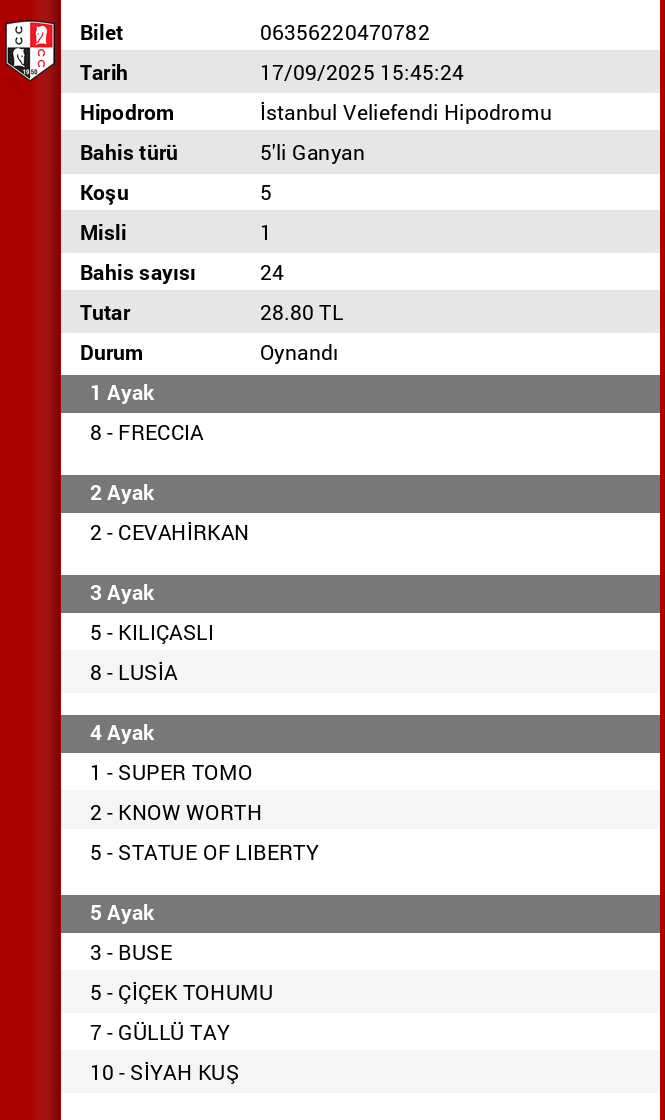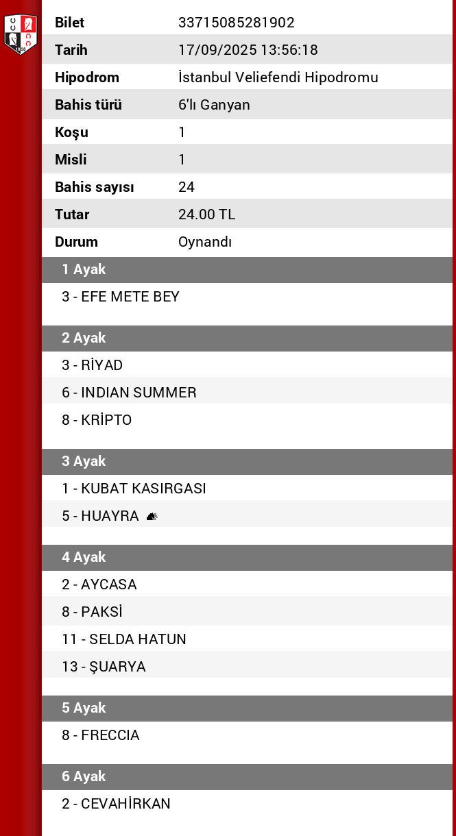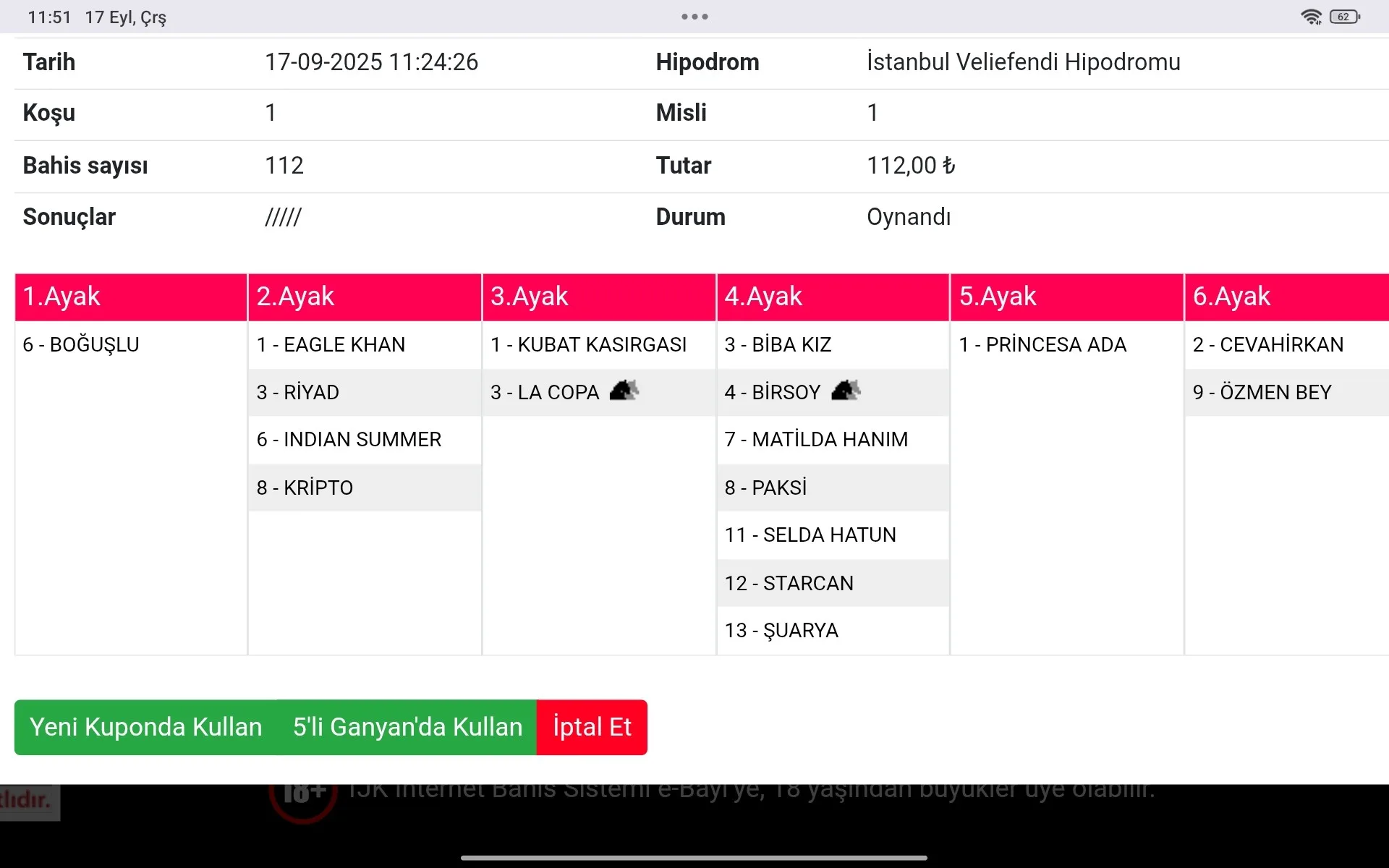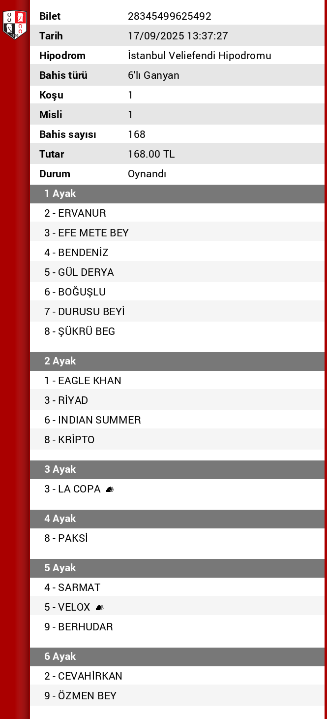Bilet no 06853070956951 Bahis türü 6’lı Ganyan