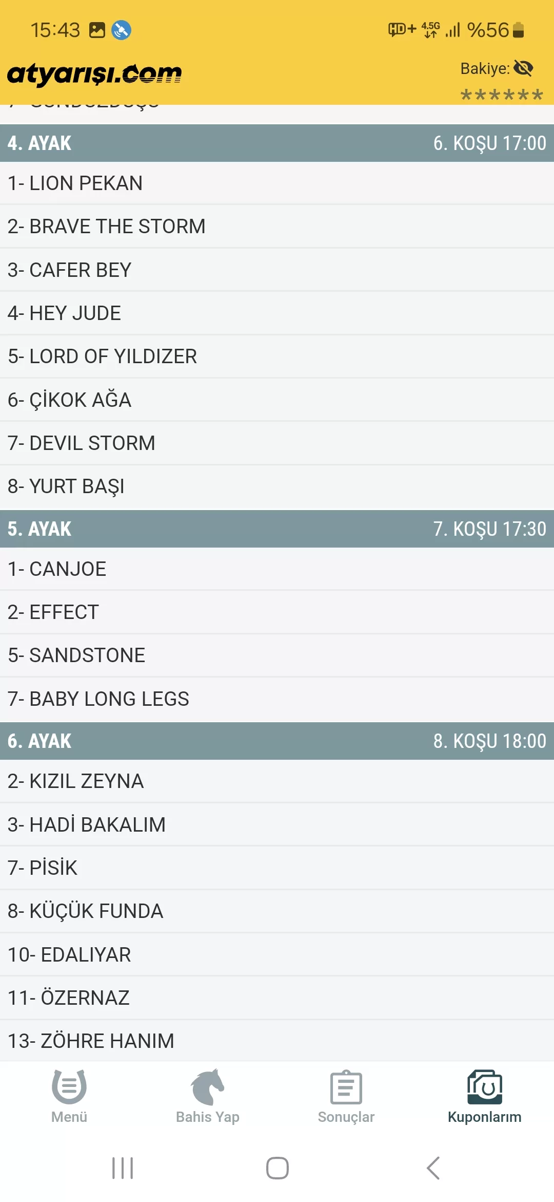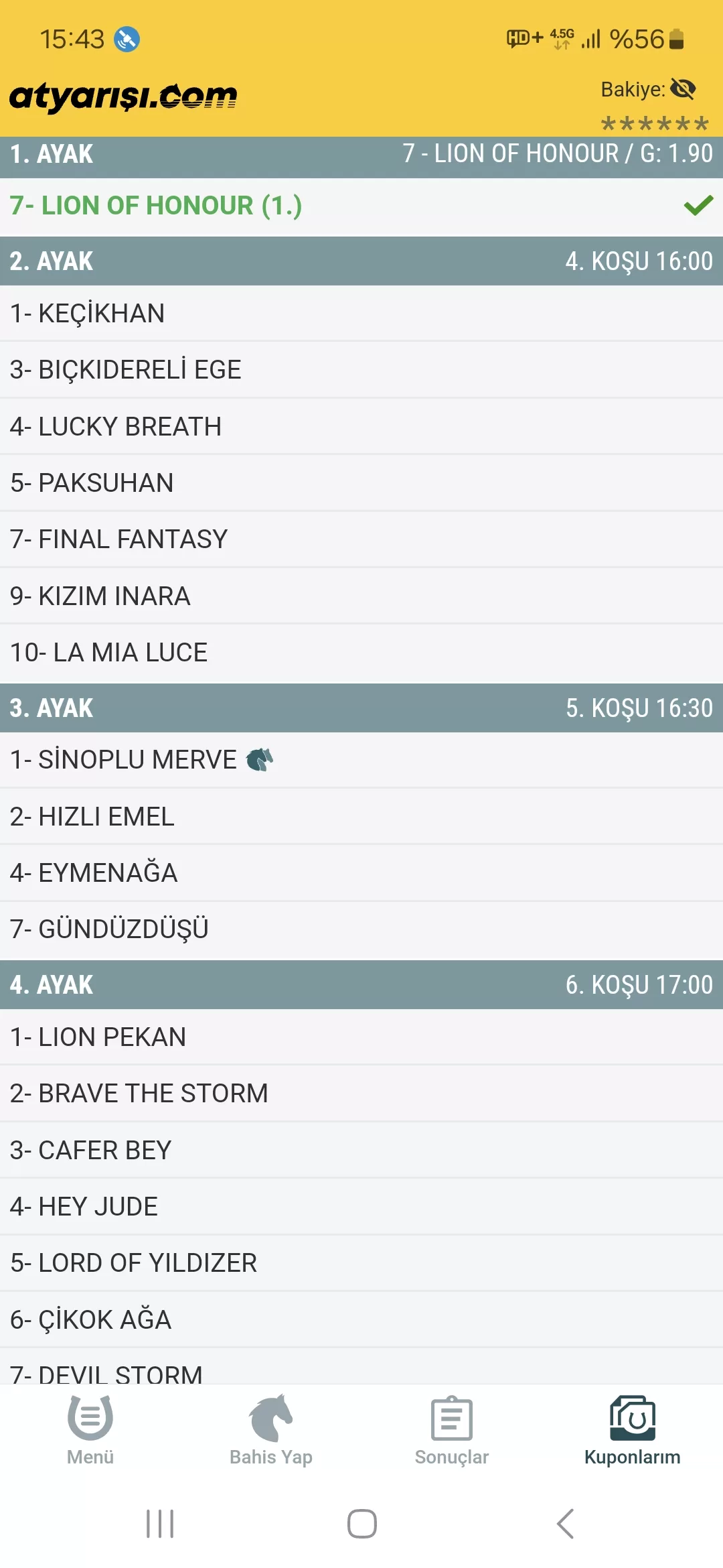5.AYAK: 4 LION BRUSK, İstanbul’daki uzun koşusu bu gruba yeter bence. 6 STORM CRY Sadettin ile boşa koşmaz. Kurtel atı bu sebeple biniyor muhtemelen, bu koşu izleyeceğim. 4 bankom.