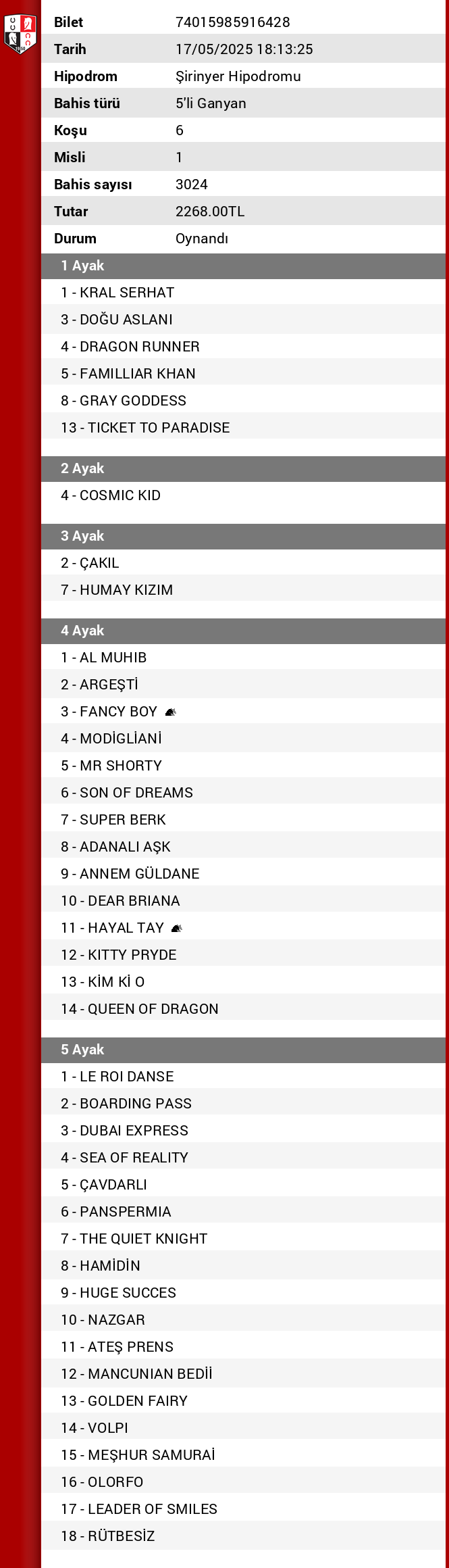 2.Ayak: 5 – FAMILLIAR KHAN, 3 – DOĞU ASLANI, 4 – DRAGON RUNNER