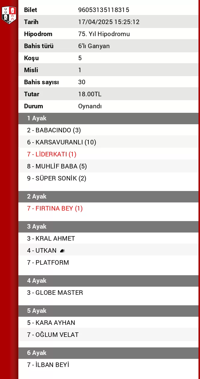 Bilet no 55544186121988 Bahis türü 6’lı Ganyan