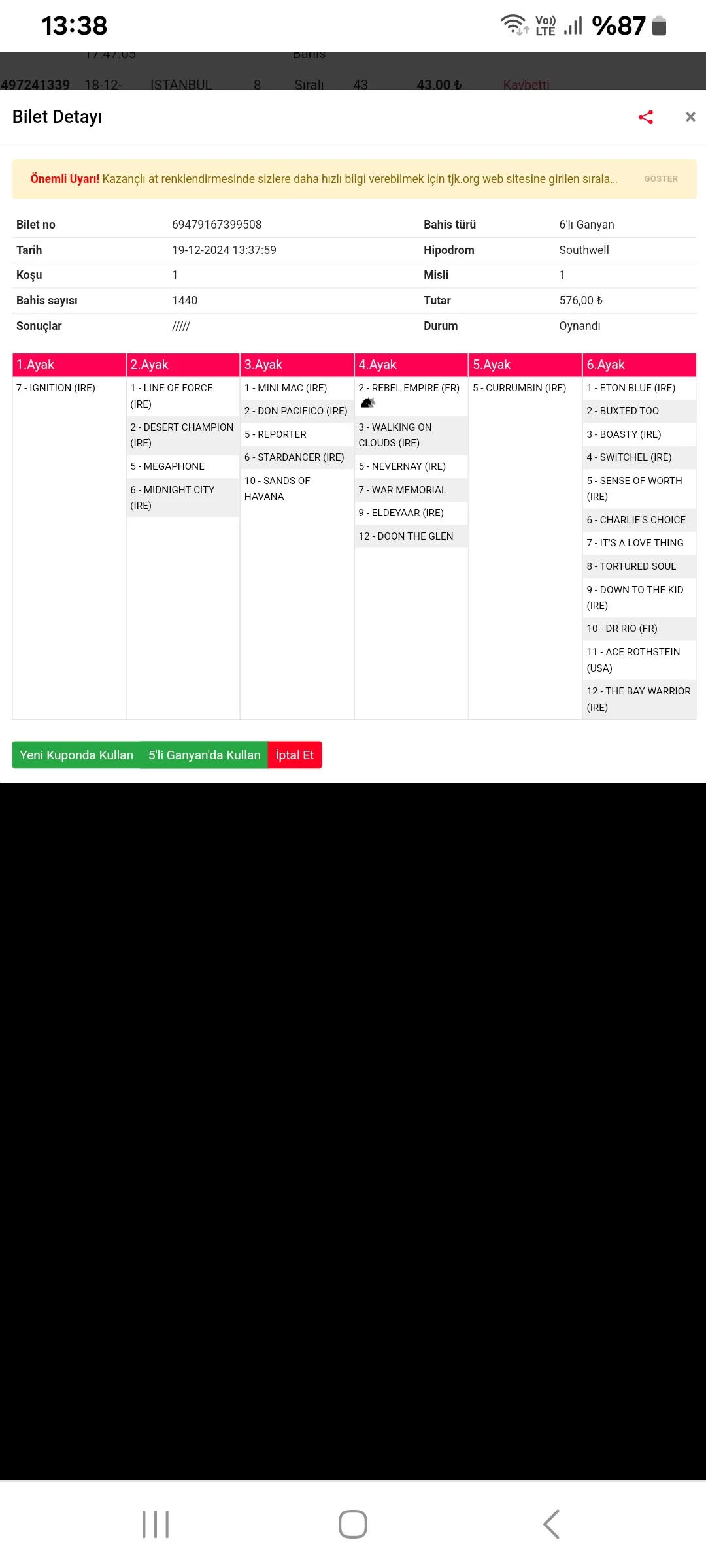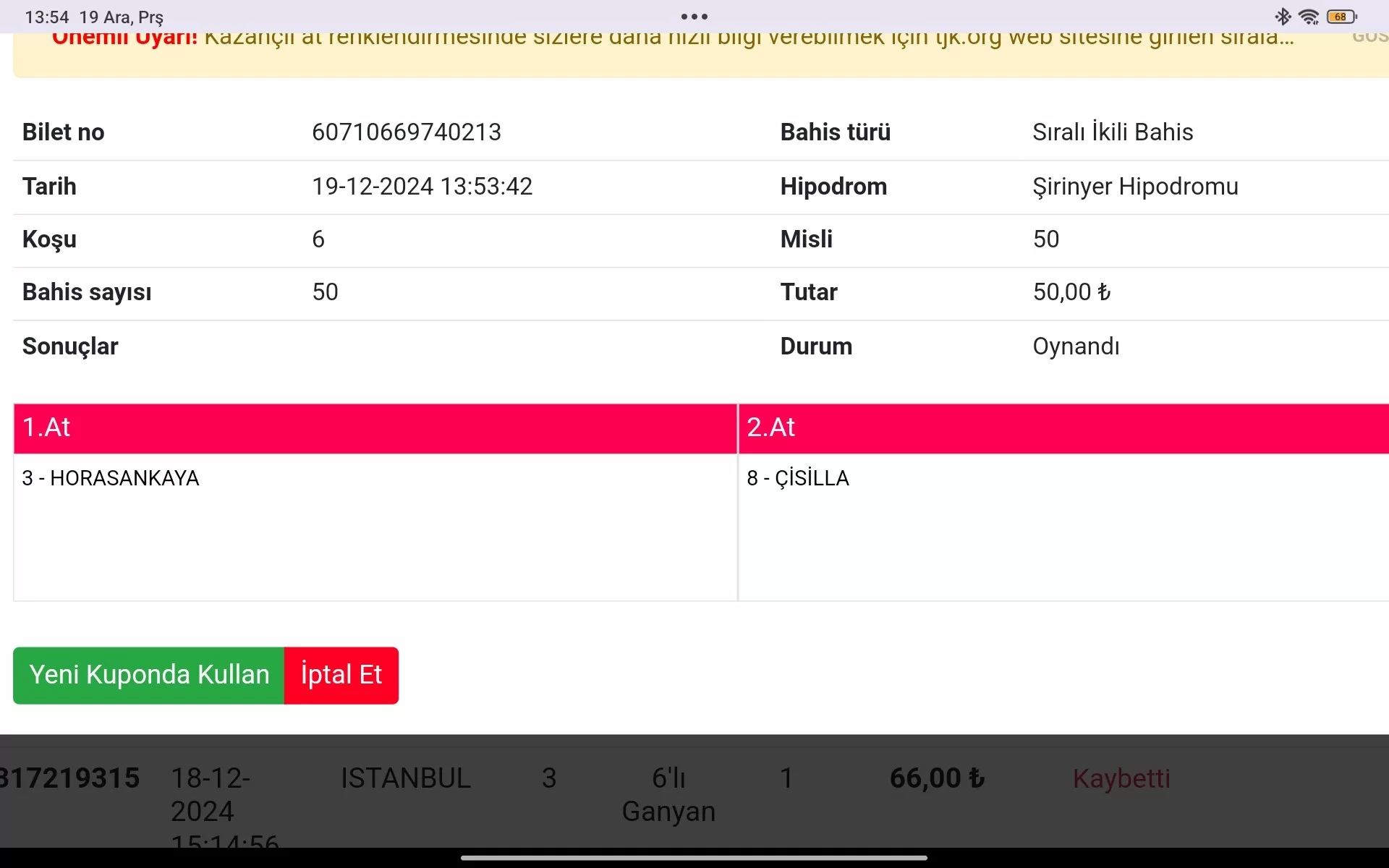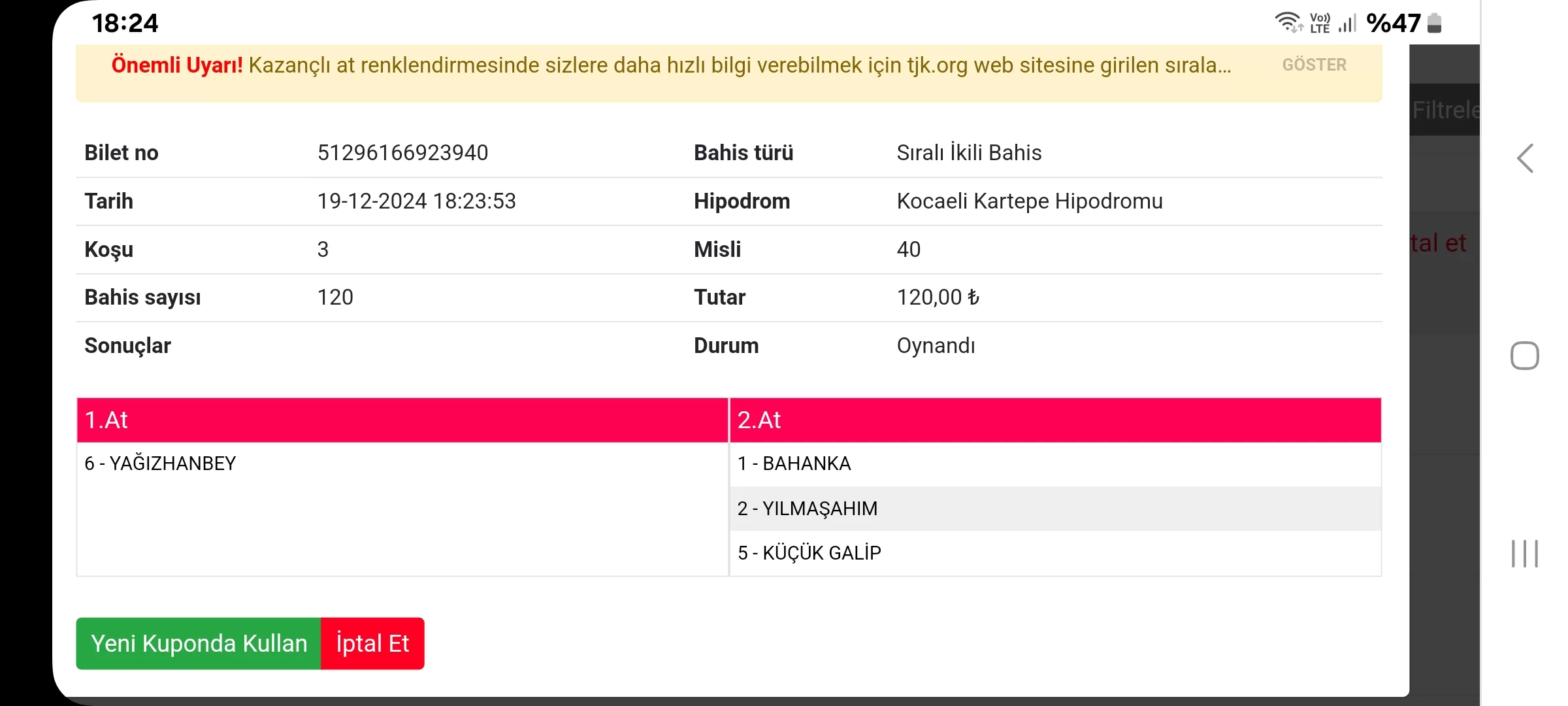 Bilet no 94636495496756 Bahis türü 6’lı Ganyan