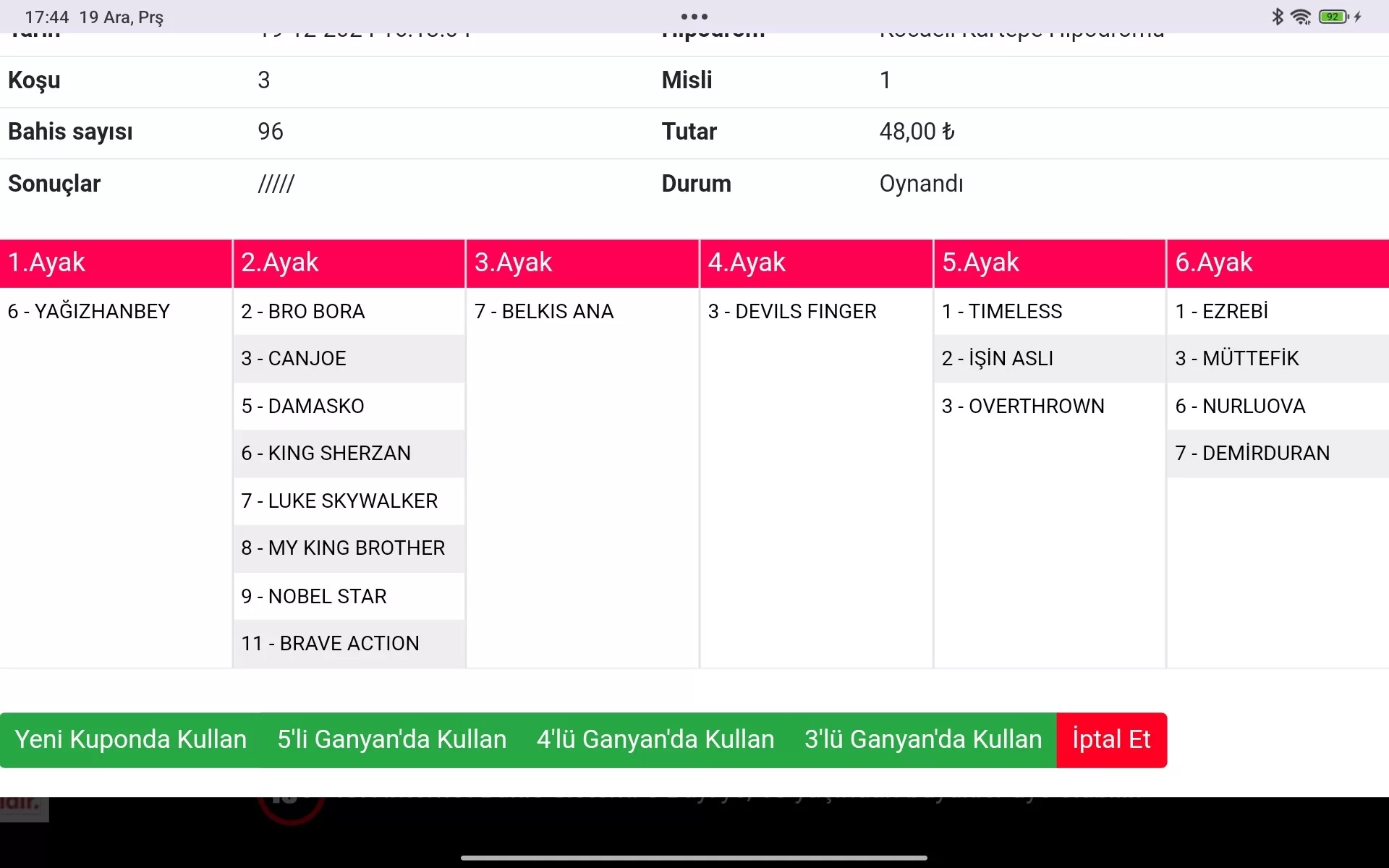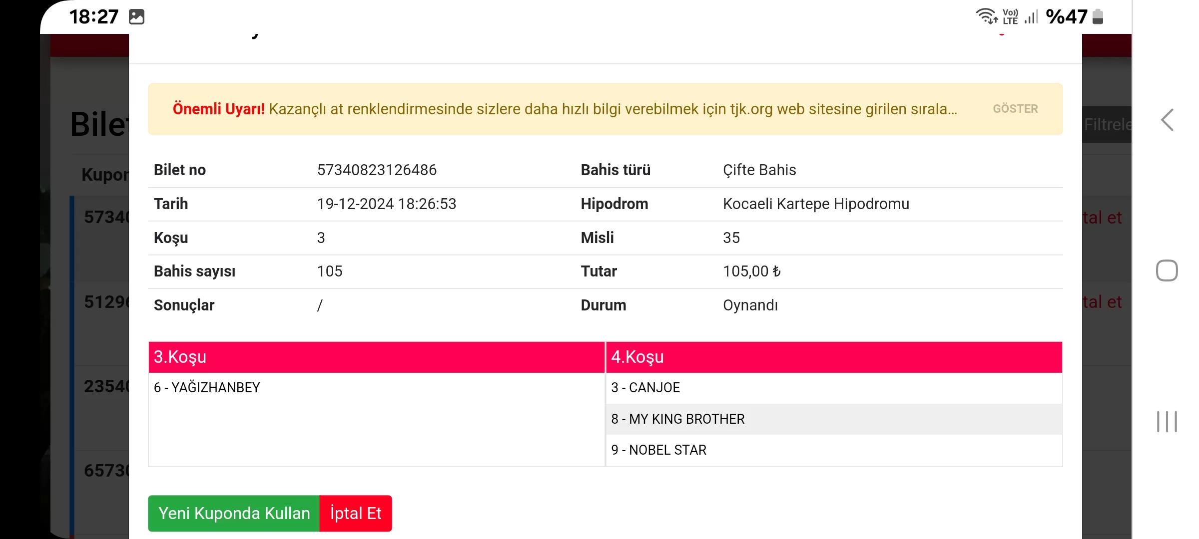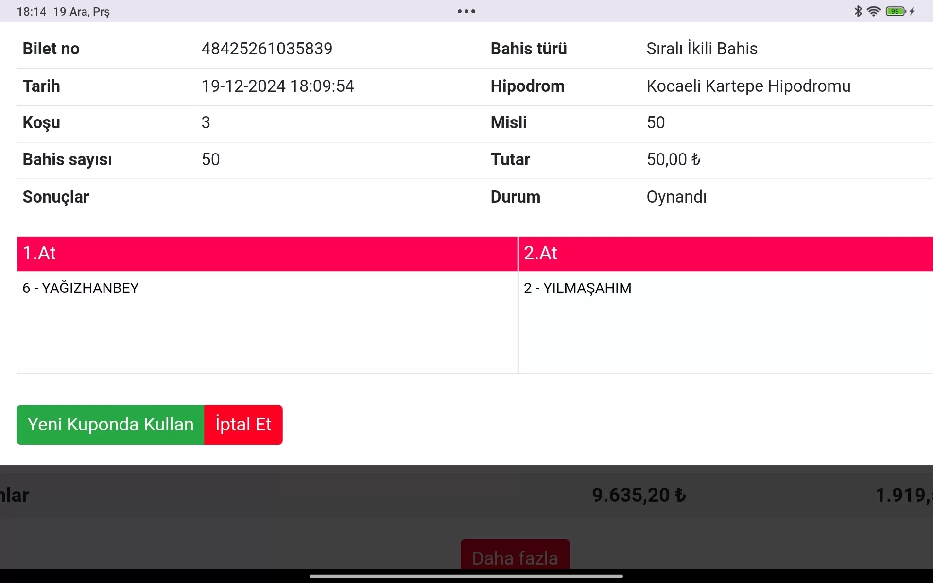 Bilet no 94636495496756 Bahis türü 6’lı Ganyan