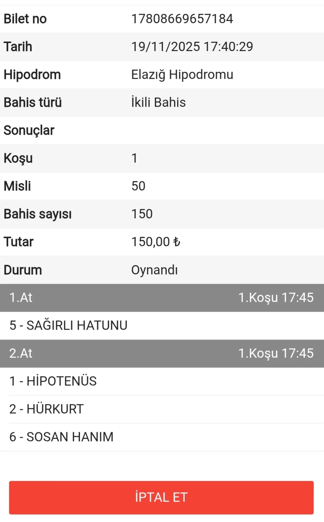 1.KOŞU : SAĞIRLI HATUNU dışına at yok 7 YAĞTU yanına yazılır