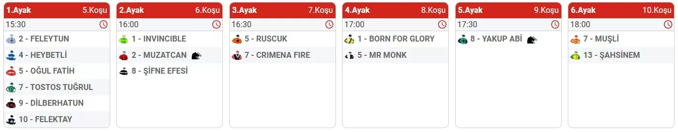 KÜÇÜK YUNUS 6. olmuş. Duramiyoruz ancak haklisiniz dogu yarislarindan uzak durmak lazim. Pek keyifde alamiyorum ben sahsen dogu yarislarindan. Sacma sapan sonuclar. Viraj donulur ya sacma sapan bir at cikar uzak ara uzar gider, veya atiniz kazaniyordur uzak ara ama gerilerden bir at kanat takar gelir elinizden alir yarisi. Kanatlanan bazen sizin at da olabiliyor tabi:) Ferit de ayri bir boyutu dogunun. Yazsaniz da, yazmasaniz da mutlaka gelir yatirir sizi. En iyi ihtimalle kuponunuzu, kurgunuzu mahfeder birakir. Ben sahsen bu jokeyden cektigim kadar baska hicbir jokeyden cekmedim.