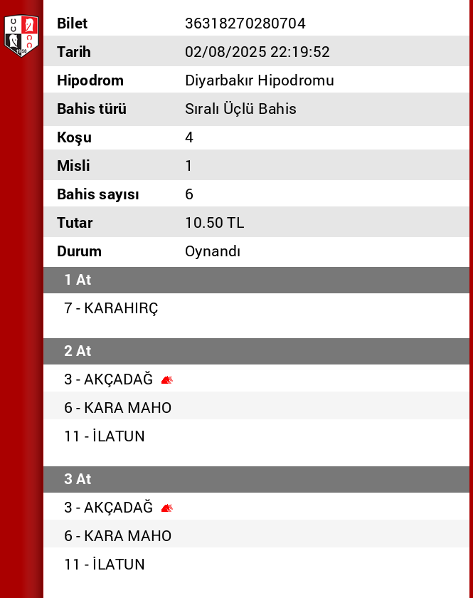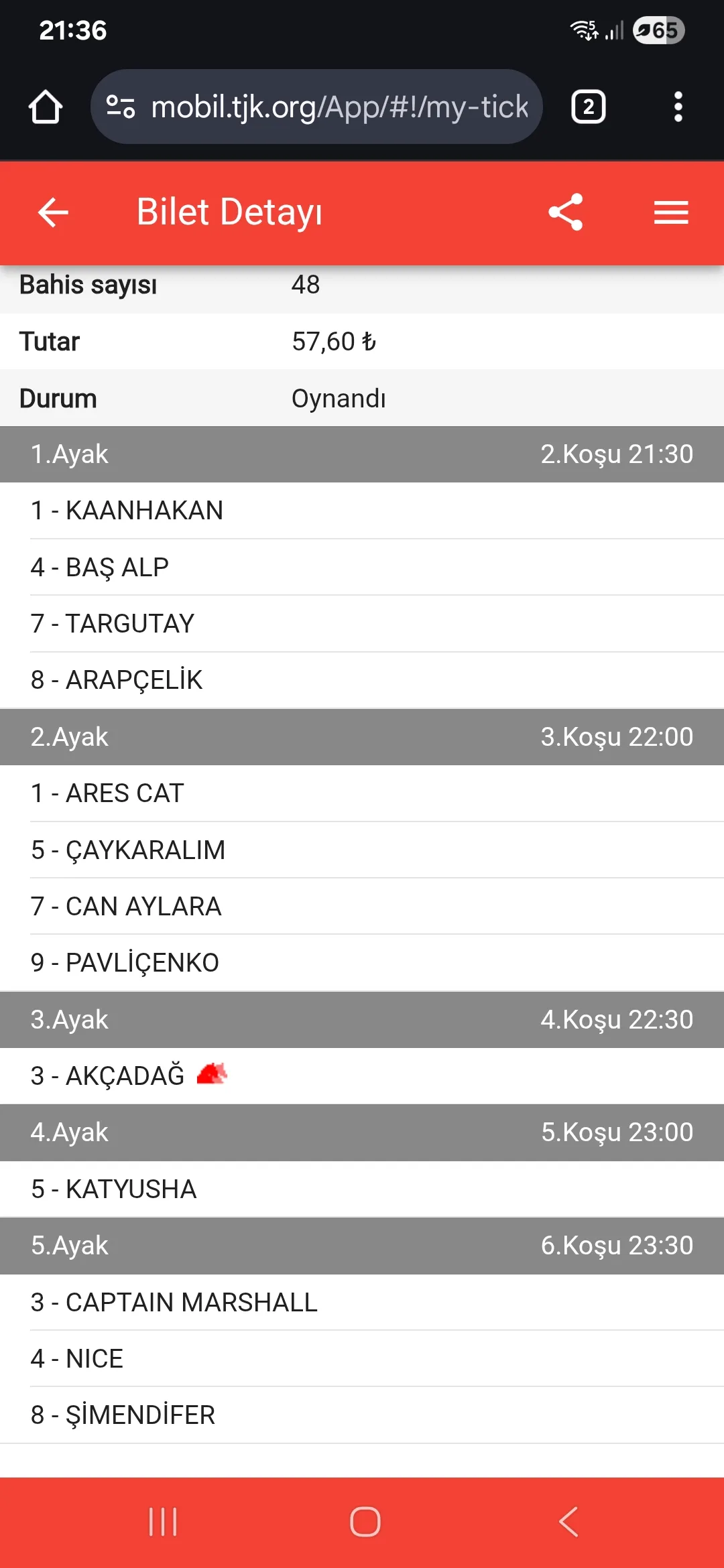 Bahis sayısı 450 Tutar 360,00 ₺