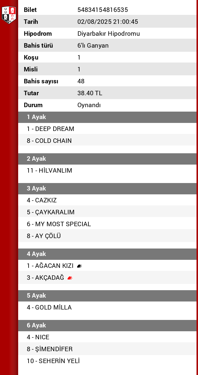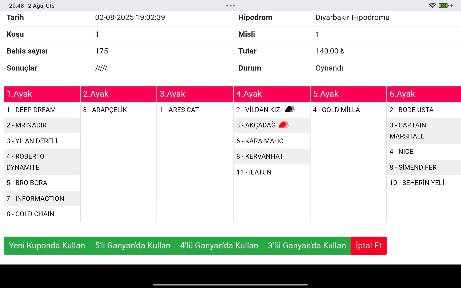Oynuyoruz ama hic hazzetmiyorum dogu yarislarindan. 5. ayak, tamam at 5 boy gec cikiyorda sans verilen bir atın 1200 metre mesafede 1. ile arasında 6 saniyenin uzerinde de fark olmamali. Bu ayagi muhtemelen gecerim diyordum. Son ayakta yatmayi bekliyordum. 5 te kalacagim icin son ayak gelir simdi, dur gidem simendifere oyun yapam :)