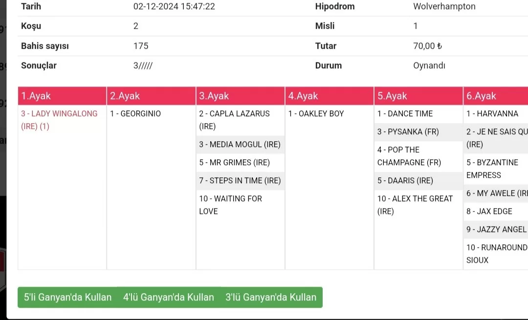 1.AYAK))) Düzlükte tam bir süpürücü olan 3 LADY WINGALONG yine cok cok etkili olur.müthis yükleniyor son düzlükte..bazi yarislarda tek bi at tempo yapip rahatta birakilirsa onu yakalamak düzlükte zor olabilir .burda da öyle bi isim var ve bence yalniz kacacak önde.sadece 9 a bit of bear belki bozabilir ancak yalniz kalma ihtimaline göre konusuyorum.o da 5 GUETAU..her ne kadar PLUMETTE ye gecilmis olsada fark sadece 1,5 boy falan.ancak simdi gidisat avantaji var.1 SAFANA ilginc bi at.boslukta yapiyor gibi totolari,rakiplerde biraz sert gibi.ancak dileyen yazabilir.kapali kutu.