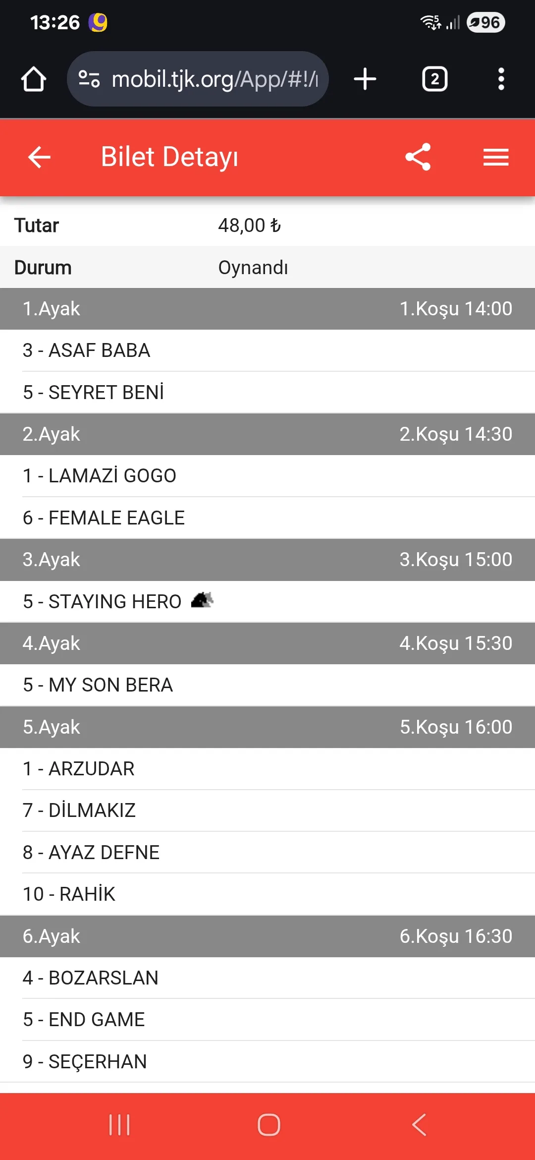 2.KOŞU: 4 MAJESTIC HOLIDAY bu safkan mesafede çıkıp bitirmeye çalışıyor ki yaptığı da oldu bugün yanına gelecek bir at göremiyorum gibi alacak liderliği yine 6 FEMALE EAGLE son yarış resmen yürüyerek kazandı el değmeden ilk rakibi olur 5 BEST ALYA kuma dönüyor dikkat