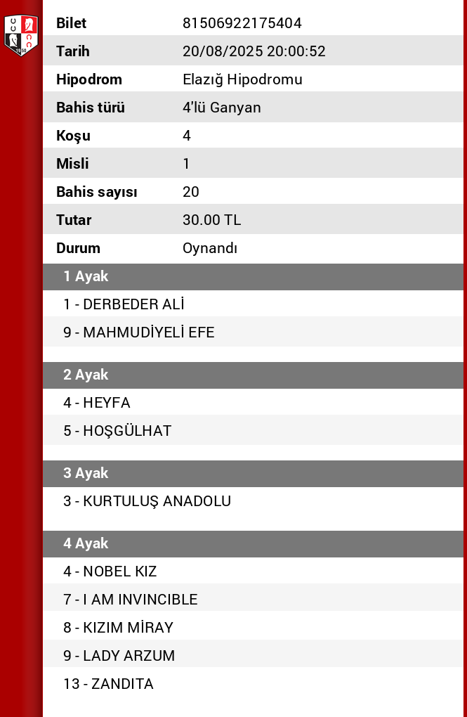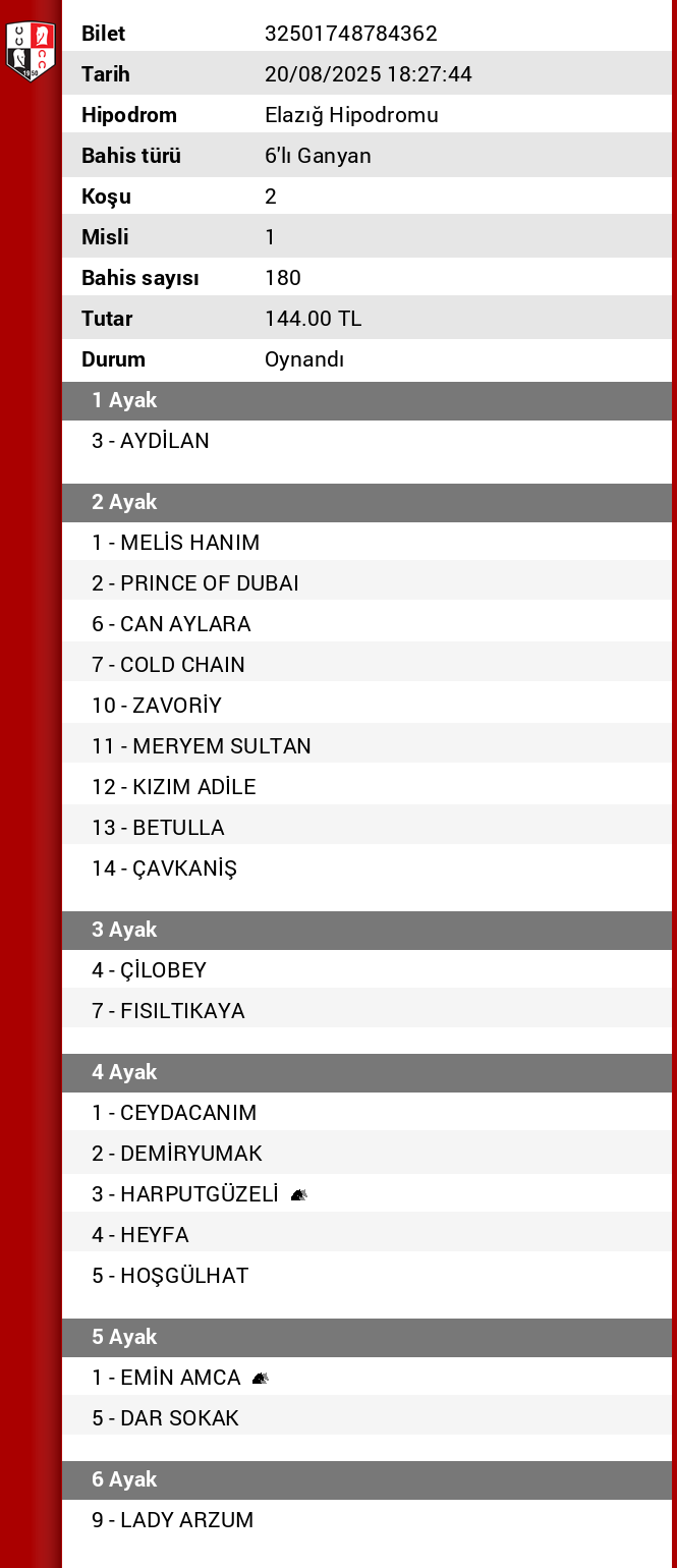 4.AYAK :  2 DEMİR YUMAK 3 HARPUT GÜZELİ 4 HEYFA yarış kötü bunlarla geçmeye çalısıyoruz