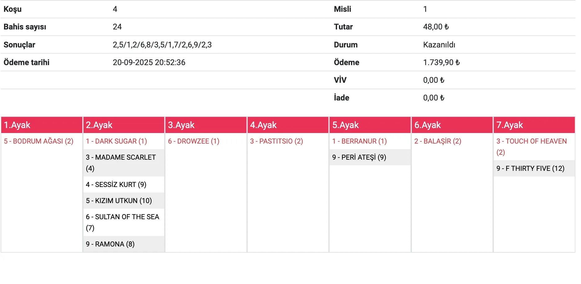 Evet evet usta bugun tam bir RobinHood tarzında para dagitmis:) 6’li yakalayan var ustadan. Keske ustanin da tutsaydi. O kadar emek ver koca okyanusu gec git derede bogul. 7 at ile yatmak cidden aci verici ve uzucu. Hemde plase bir attan, hemde Ahmet Hasan Bayar gibi doguda son derece formda bir jokeyden. Cidden yazik oldu.