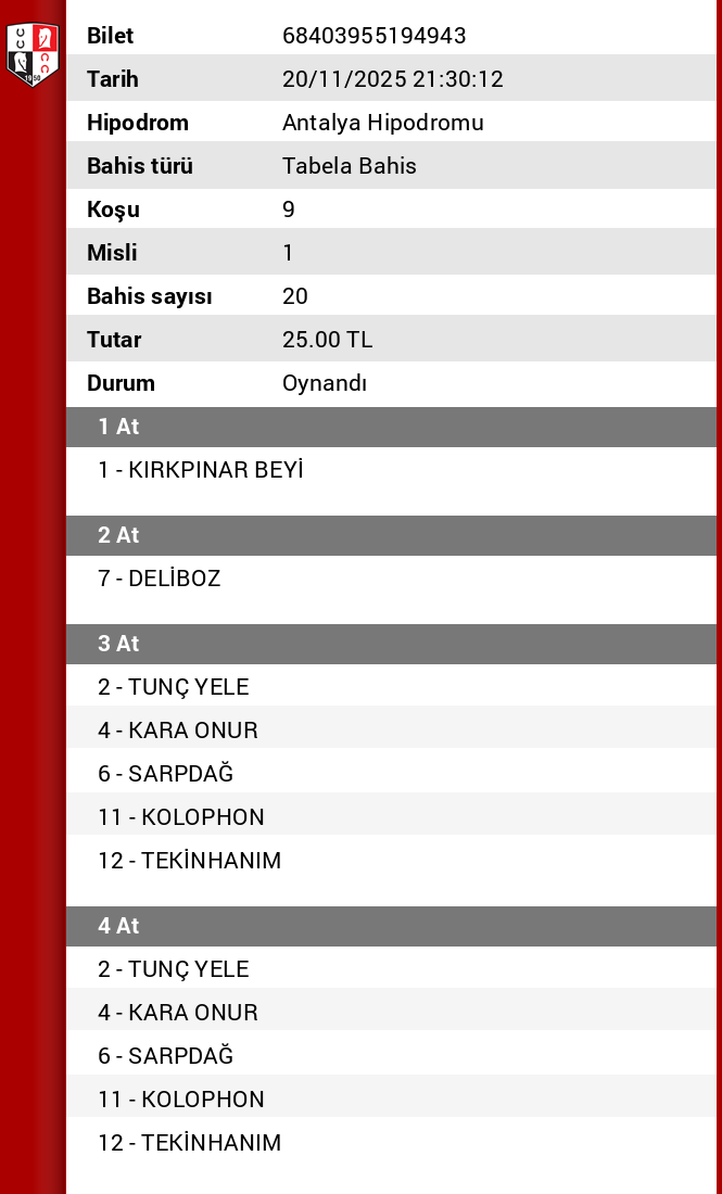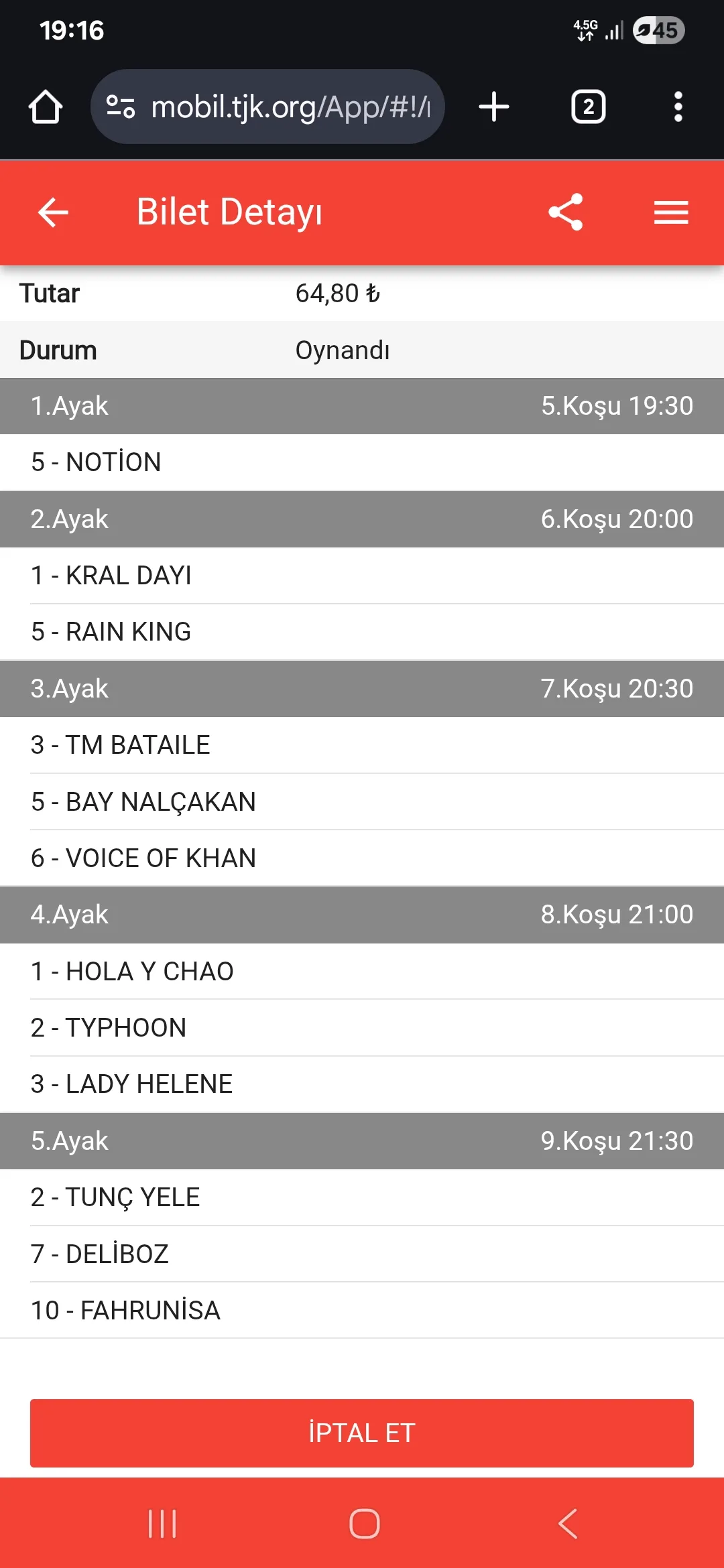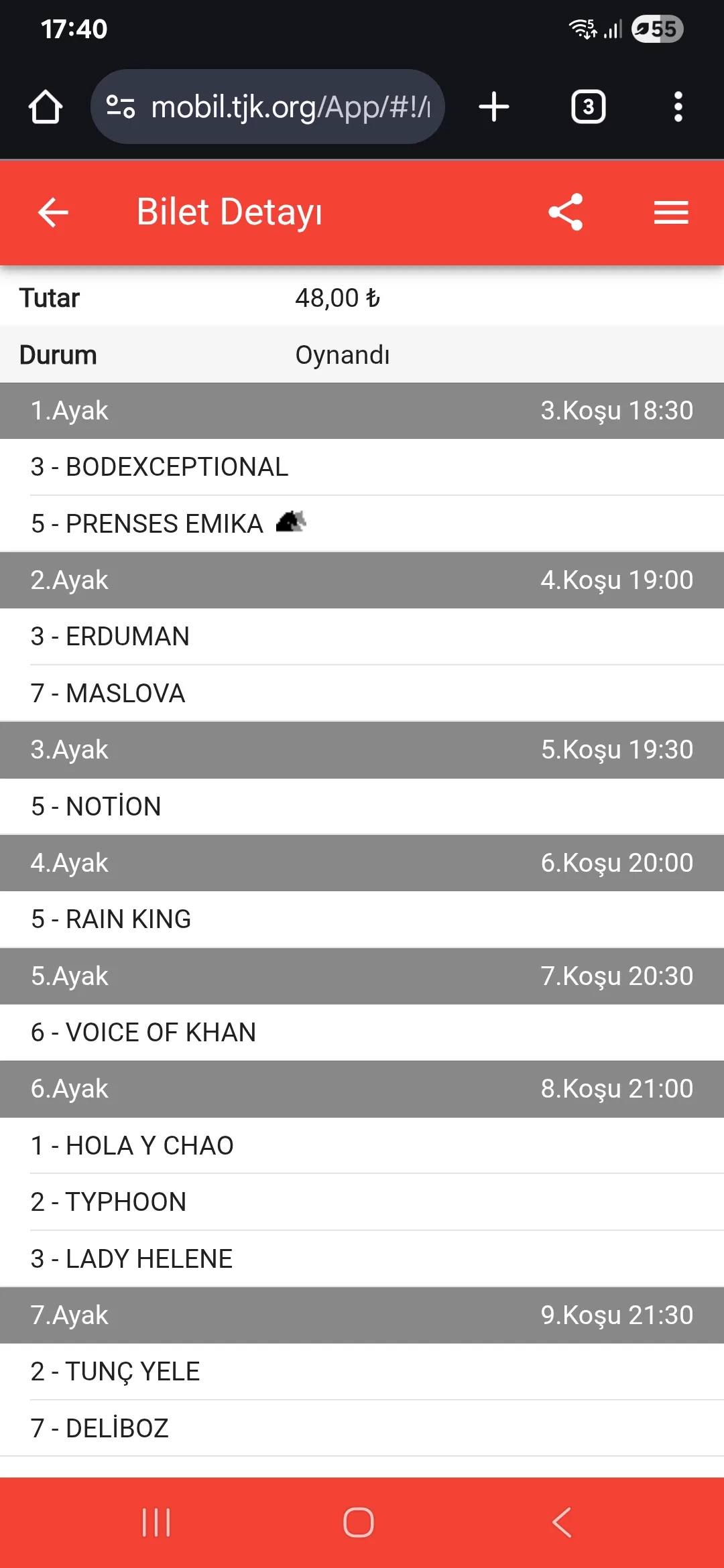 Uyusak kaçiyor, uyansak kaciyor(benim için) :) Evet gayet guzel ikramiyeler. 4’luler de mislilikti. (4)Lord Of Dragon biraz para yapti. Cok kisi 1 ve 3 arasinda kaldi. Cok at bulduk ama yine olmadi Adminim. Dun de iyi para gitmis sizin, gecmis olsun :(