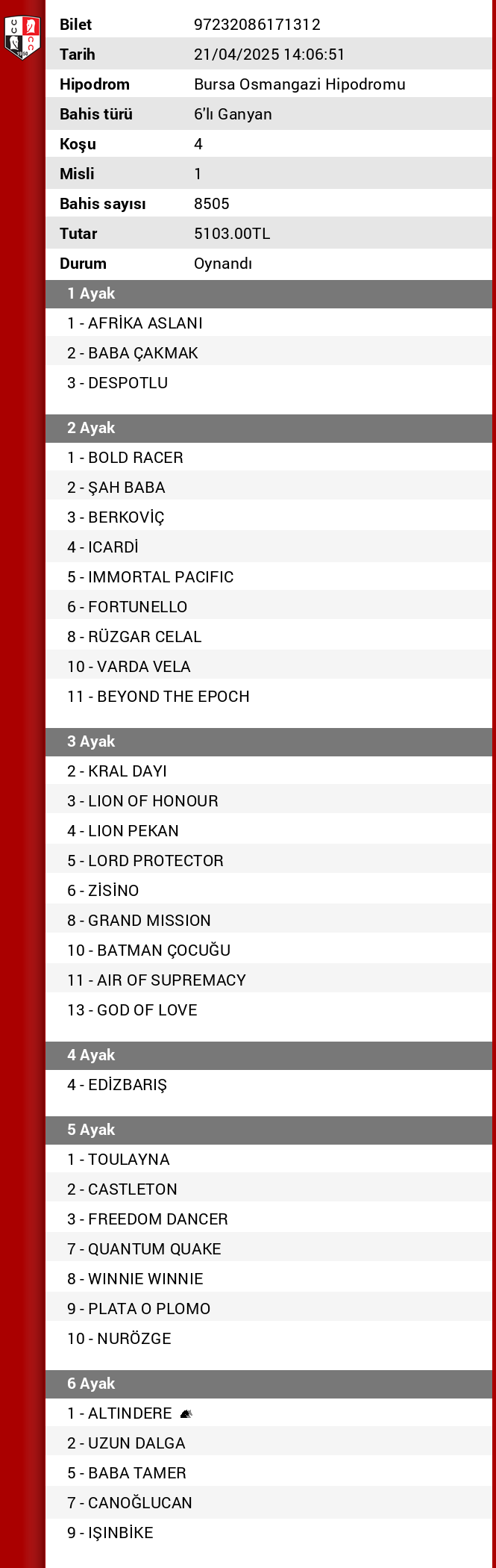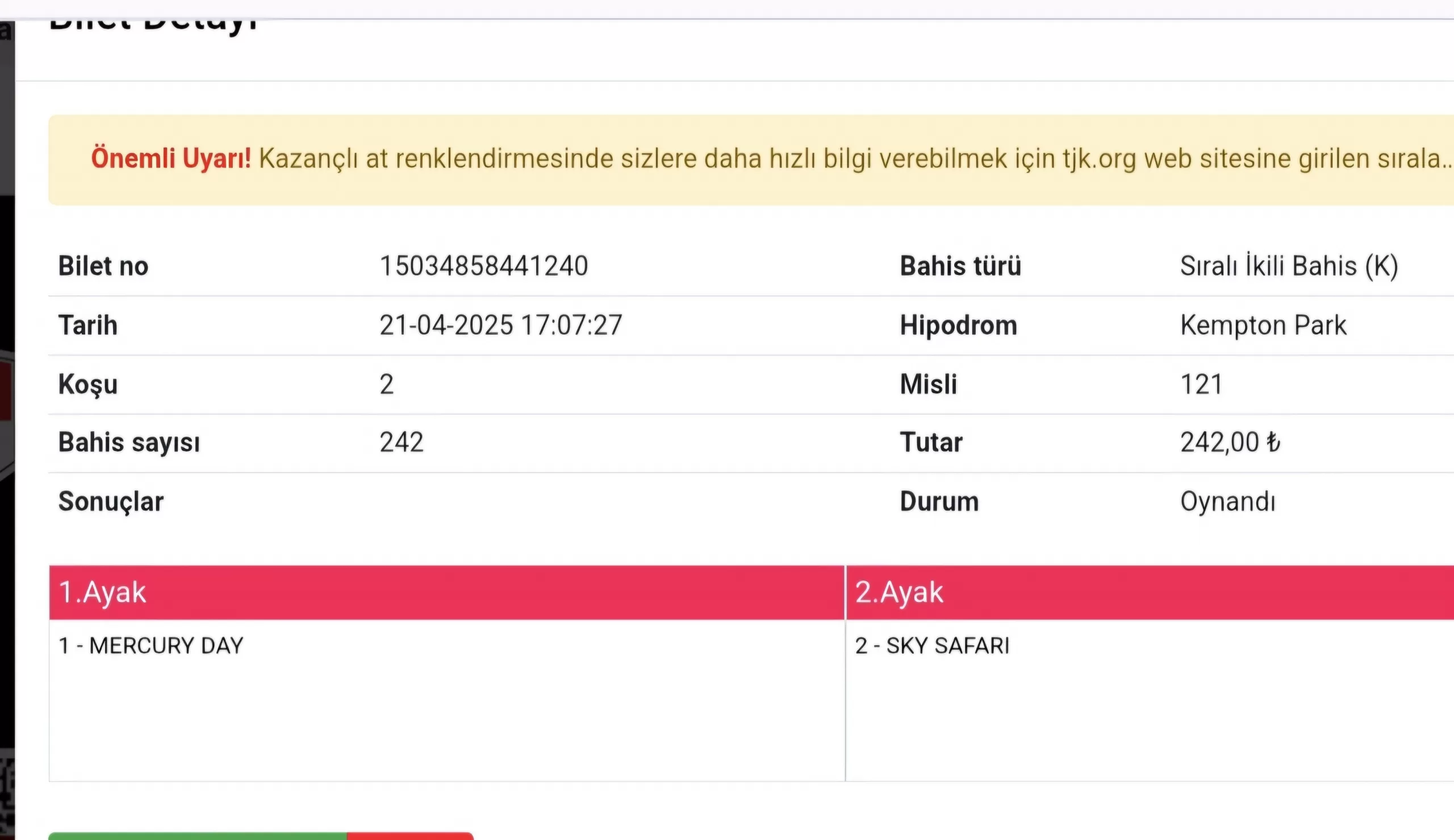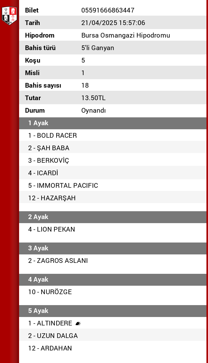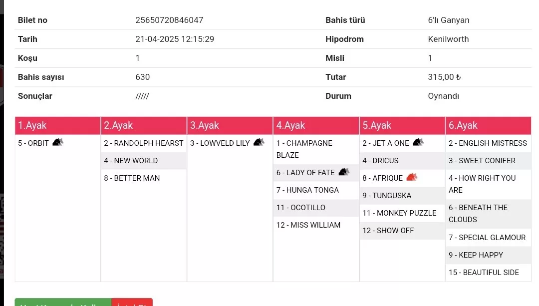 Bilet no 01109940093461 Bahis türü 5’li Ganyan