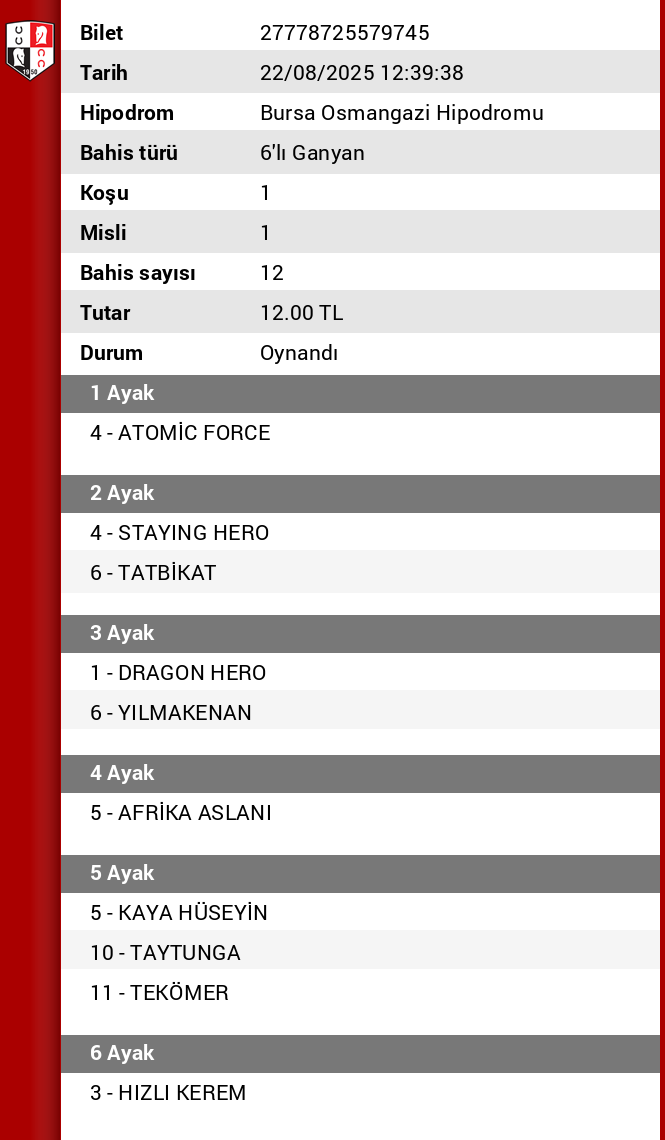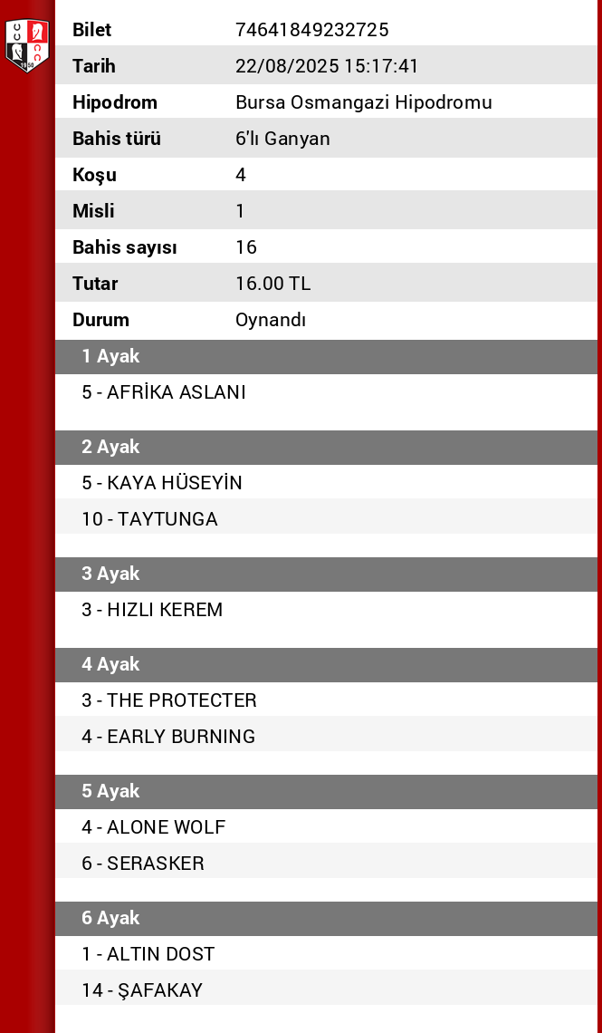 Bilet no 42375286962318 Bahis türü 6’lı Ganyan