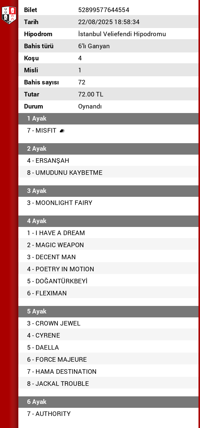 4. ayak) Son yarış büyük bir sürprizle deo volenteyi geçen Decent Man’e neden Abiş binmemiş şaşırdım…gerçi abiş bindiği atla da 4/6 kazanmış… Ben yine de ilk şansı geçen yarışın tesadüf olmadığını ispatlamasını beklediğim 3 DECENT MAN’e veriyorum… Daha sonra ideal mesafesine dönen ve önde temposunu kurmasını beklediğim 2 MAGIC WEAPON diyorum… Daha sonra 6 FLEXIMAN ve 4 POETRY İN MOTION… bütçesi olanlar dışarıda kalan atları da ekleyebilir…