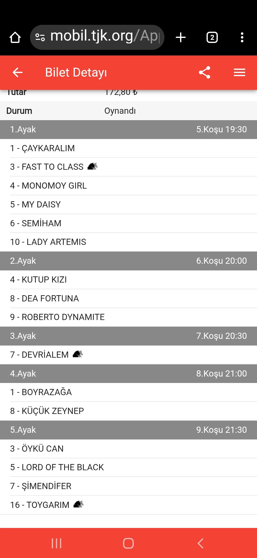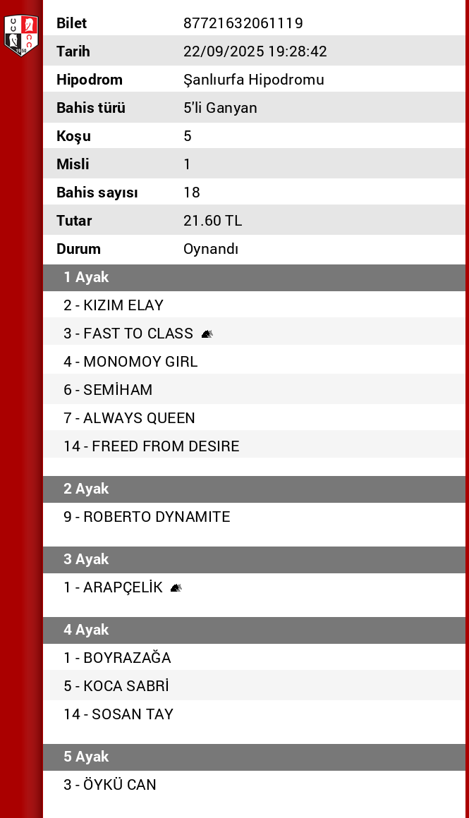 Bilet no 63381304329374 Bahis türü 6’lı Ganyan