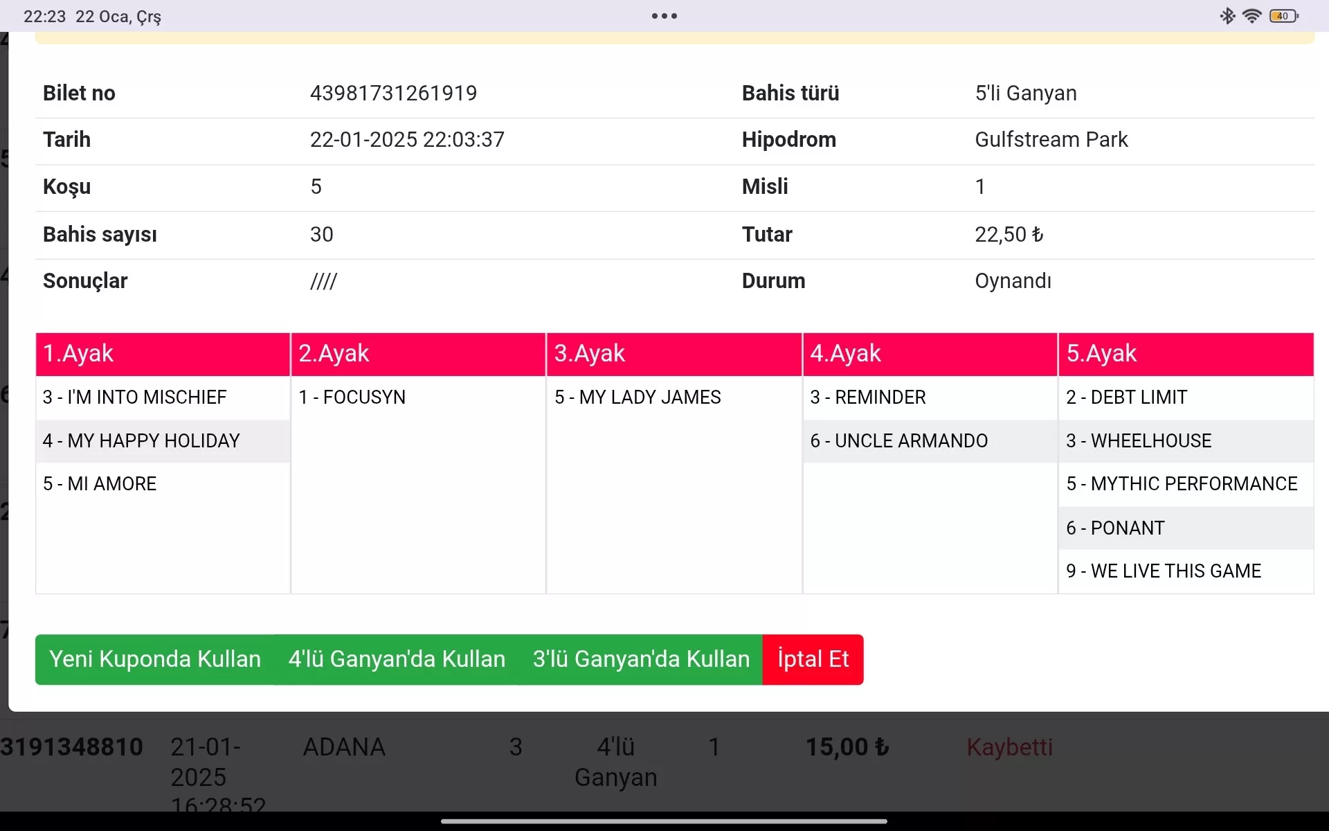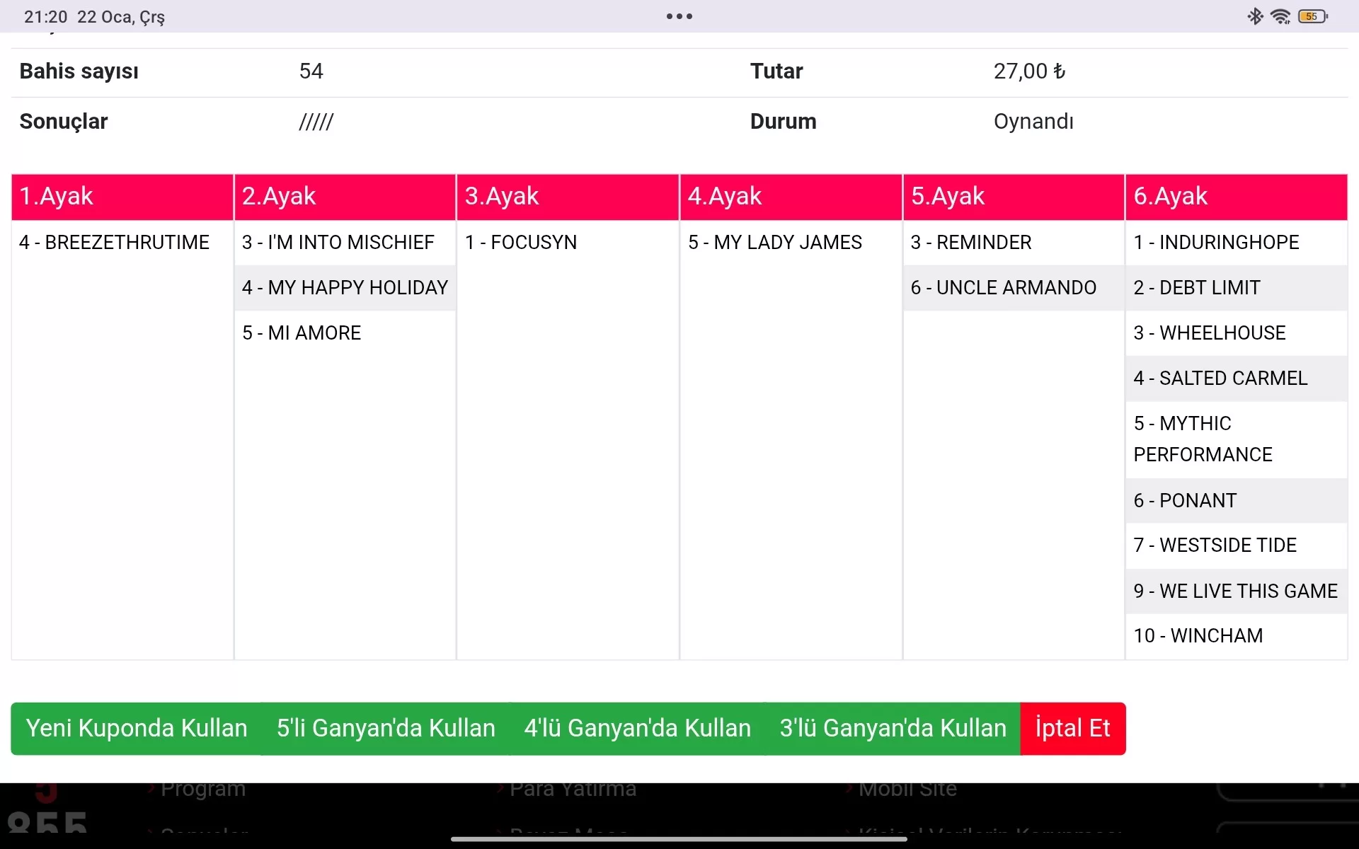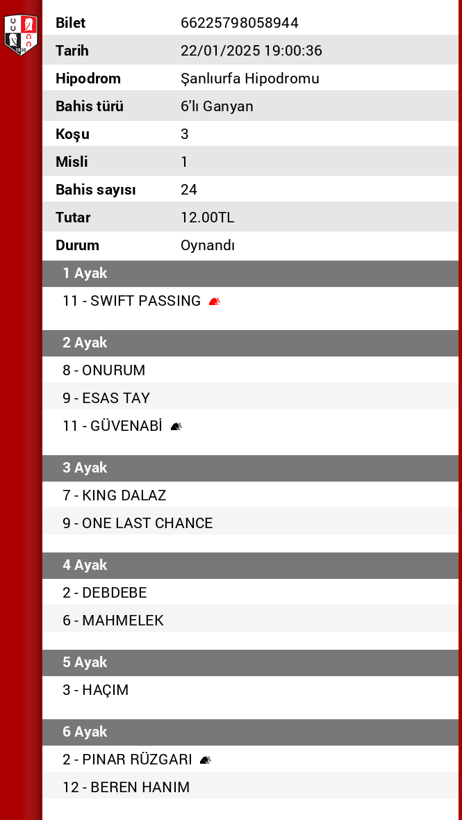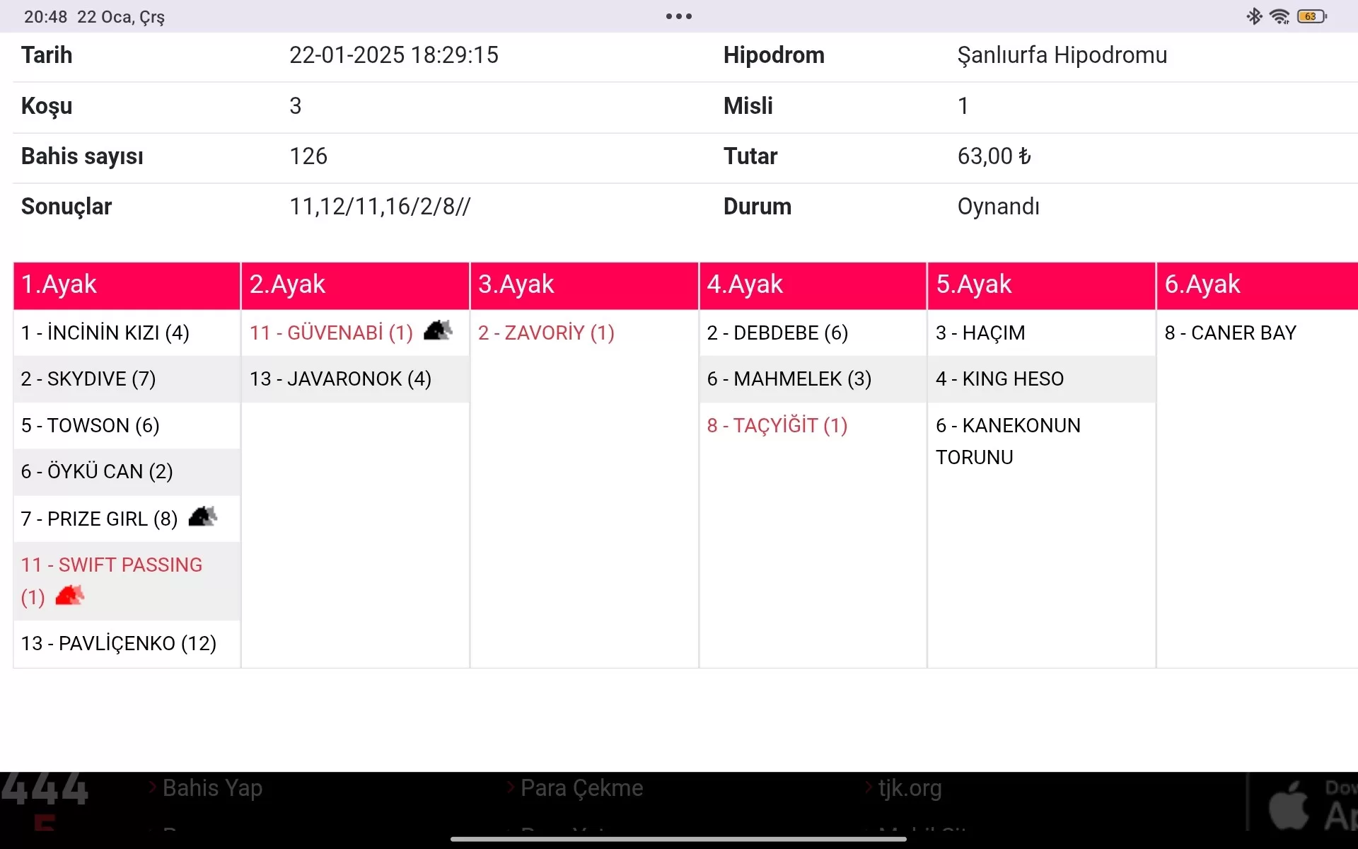 6.AYAK ====== Her isim kazanabilir şaşırmam 1 CEVHERHAN 5 KRALCEVHERİ 2 PINAR RÜZGARI  8 CANER BAY özellikle idmanı güzel ama felhan var diye uzak durdum 7 BEZANTAY 6 ATEŞ ZAMBAĞI yazılabilecek isimler ama ben tekrar aynı isime binen aradan sonra 12 BEREN HANIM dan iyi yarış bekliyorum buraya 8 10 at yazamayacağımıza göre 12 BEREN HANIM ı tek bırakmak zorundayım Mesafede uygun umarım yunus çelikbaş bizi yanıltmaz ….BANKO