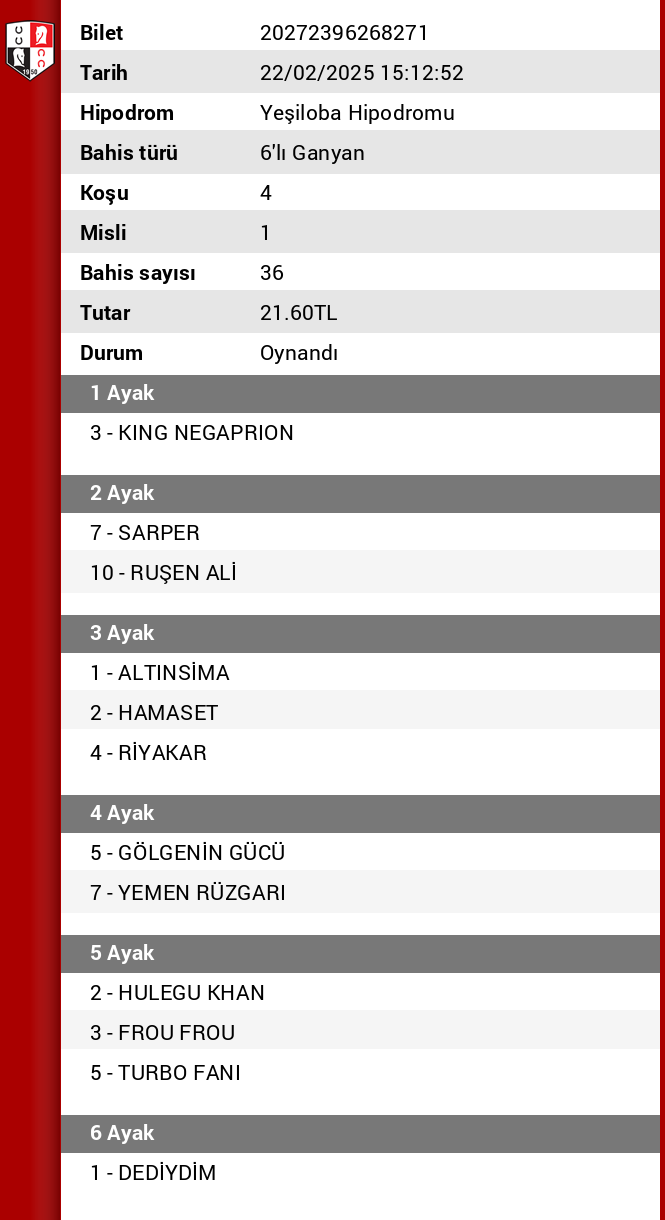 6.KOŞU: Adana Büyükşehir Belediye Başkanlığı koşusunda bu formu bulmuşken 4-RİYAKAR’ın kazanmaya yakın olduğunu düşünüyorum.Bir yarış evvel bu pist ve mesafede buradaki rakiplerini geçen 1-ALTINSİMA başta gelen rakibi olacaktır.