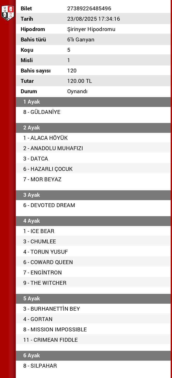 5.KOŞU: Aynı pist ve mesafede yine aynı jokeyi idaresinde daha uygun rakiplerle koştuğu ve kazandığı son koşusunda form ve performans açısından yeterli görülen DEKÇİ BEY bugün nispeten biraz daha sert grupta koşsa da yine kazanabilir. Rakipleri; YANACAK ve İMGE TAY olur sürpriz ismim ise GÜLDANİYE.