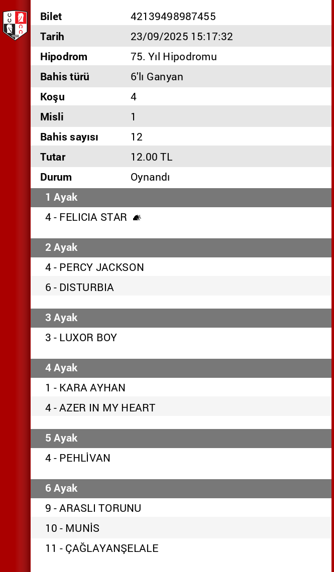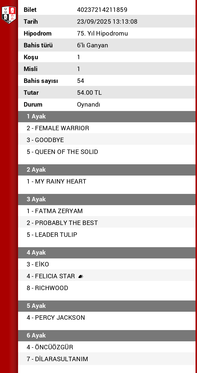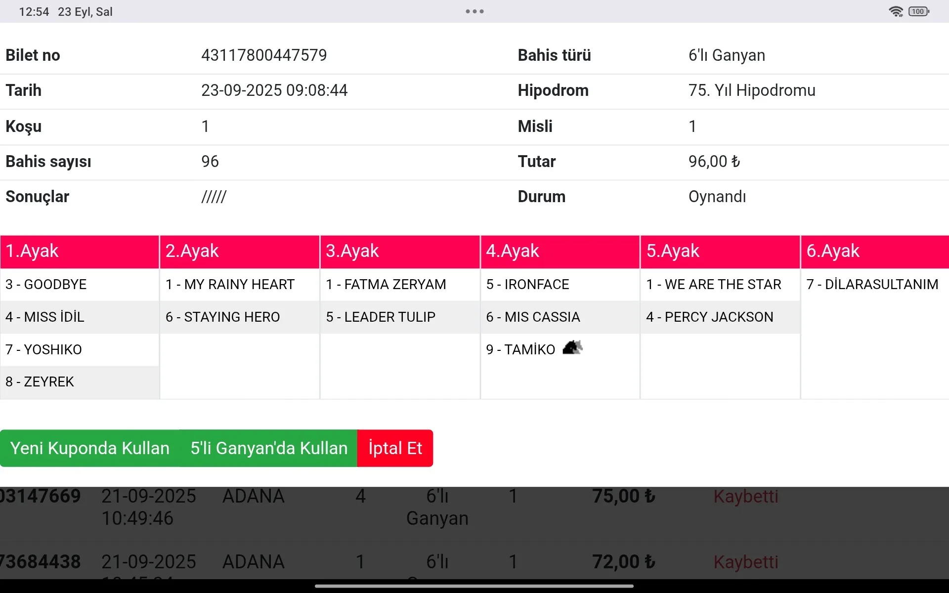 Bilet no 76626015841300 Bahis türü 6’lı Ganyan