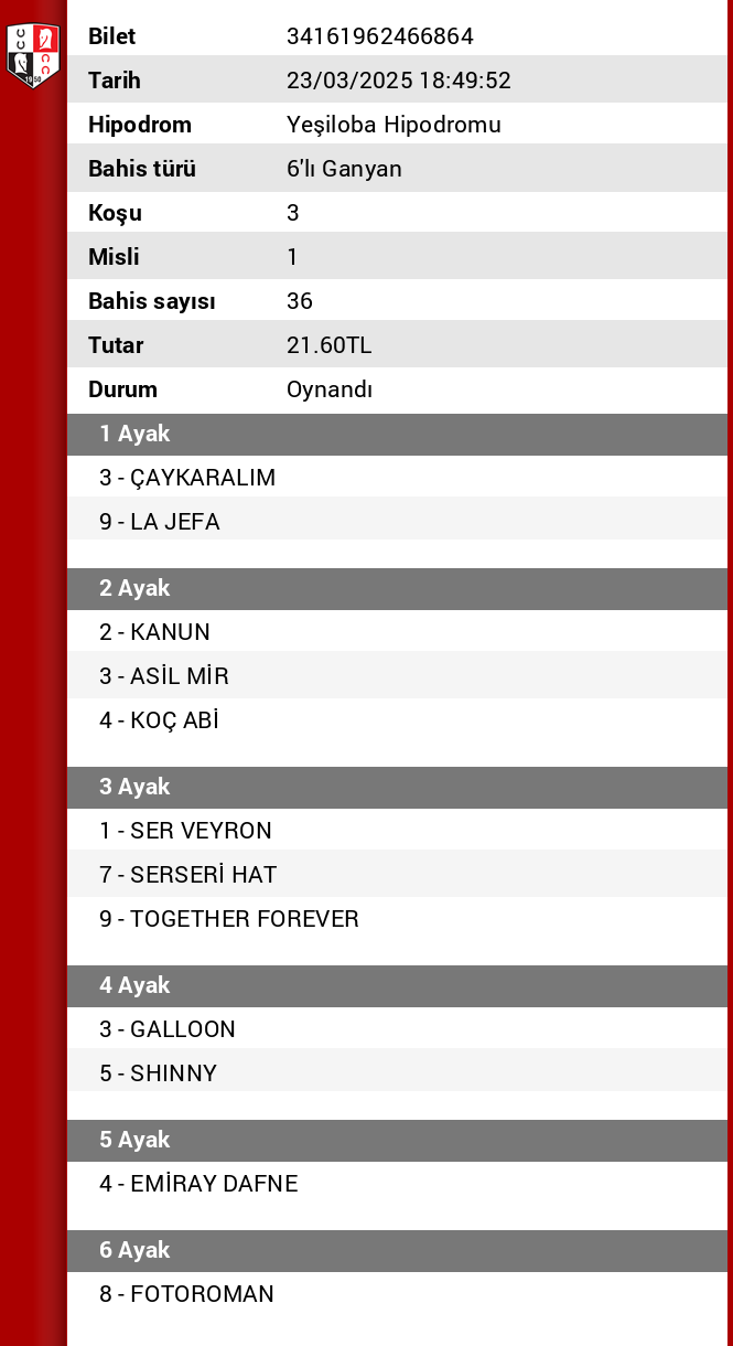 3.KOŞU: Altılının ilk ayağında çim pistteki yarış zor olacak ve çok at yazılması gerekir diye düşünüyorum. İlk olarak LA JEFA ile VİVALDİ favori hanesinde, iyi koşacak ESCAPE PATH ve sürpriz bir sonuç gelebilecek olan başta LION ATLAS, ROYAL KING ile SUNDANCE isimli safkanların mutlaka kuponlarda bulunması gerektiğini düşünüyorum. Geniş oynayanlara da HEPSİ olarak öneriyorum.