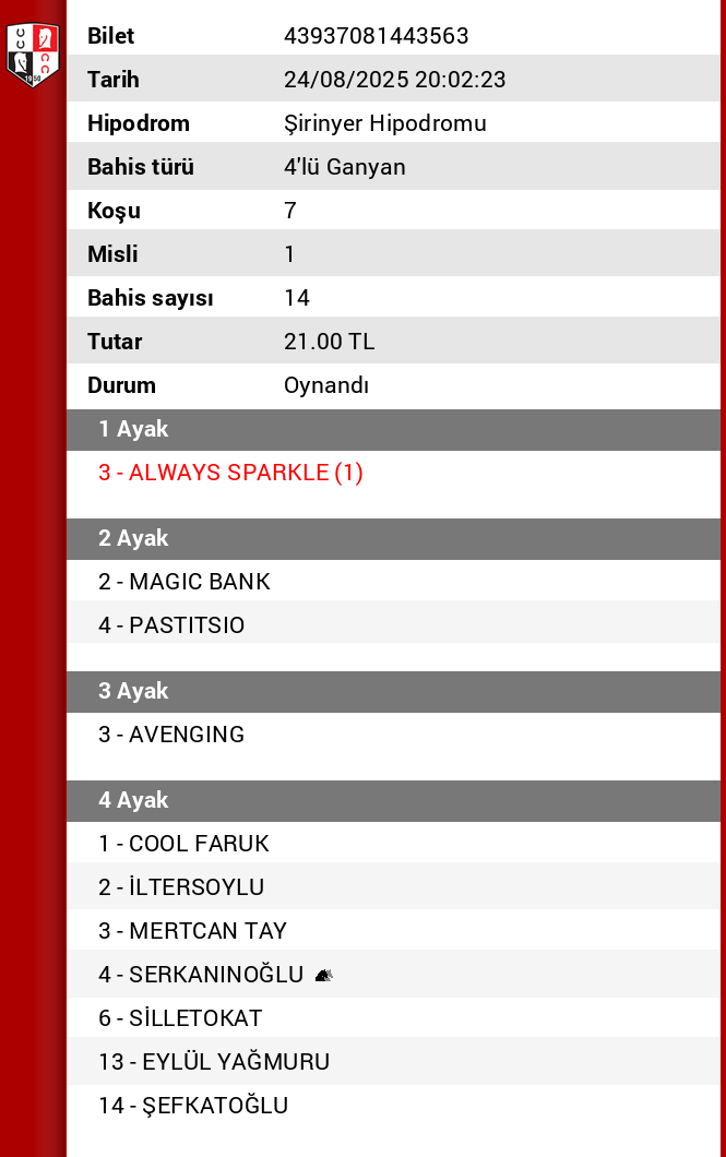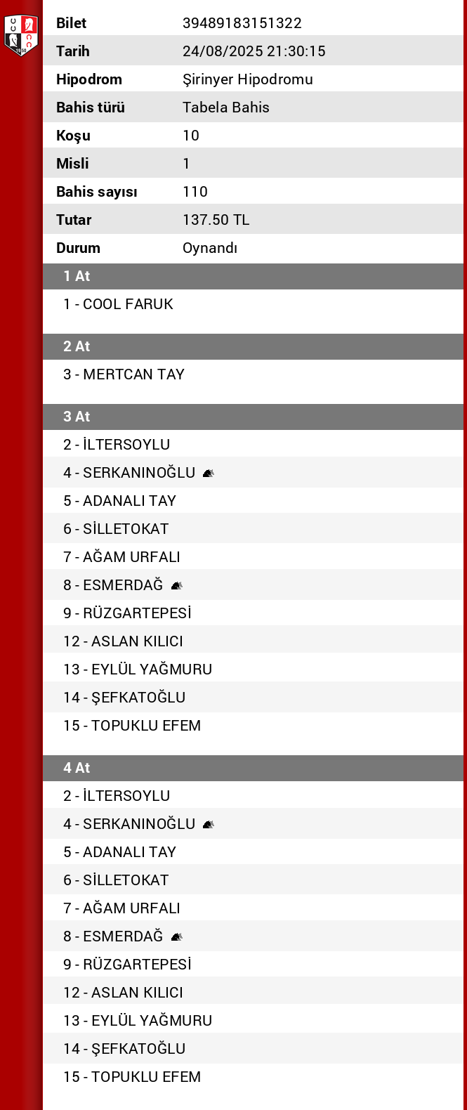 10.KOŞU: Son ayakta kalabalık kısa mesafe kum koşusunda fazla isme yer verilmesini öneriyorum; MERTCAN TAY, İLTERSOYLU ile ŞEFKATOĞLU kuponlarda mutlaka olması gereken isimlerdir. Kendimce şanslı gördüğüm diğer safkanlar sırasıyla aşağıda olduğu gibidir.
