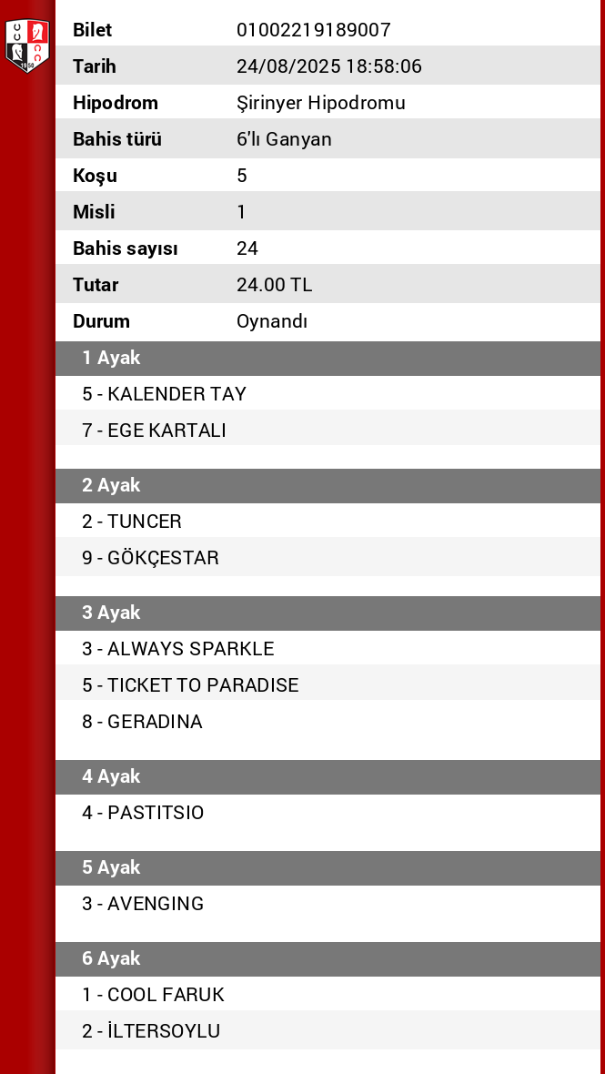 24 AĞUSTOS 2025 Pazar günü İZMİR / ŞİRİNYER Hipodromundaki 10 Koşulu at yarışı programında sayfa takipçilerimize bol şanslar diliyoruz.