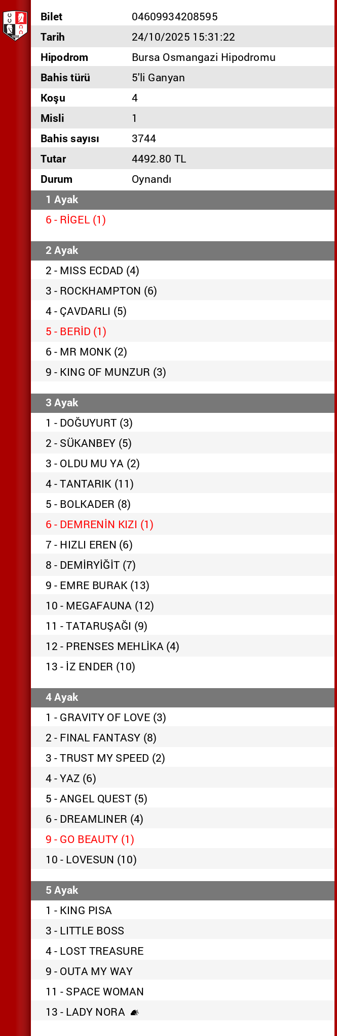 Bilet no 57442853786034 Bahis türü 6’lı Ganyan