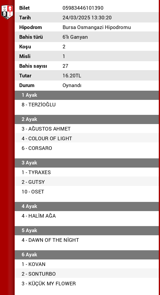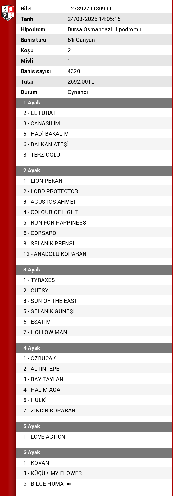 5.AYAK: İstikrarsız isimlerle beraber jokey seçmenin de zor olduğu bir koşu. 3 TIROL HOPE ilk uzu mesafe deneyiminde sürpriz yapabilir. 11 STORMY RIVER uygun kilosu ile bakarsın iyi koşar. 2 İŞİN ASLI, 9 TRUE ANGE ve özellikle 1 LOVE ACTION diğer ihtimaller.