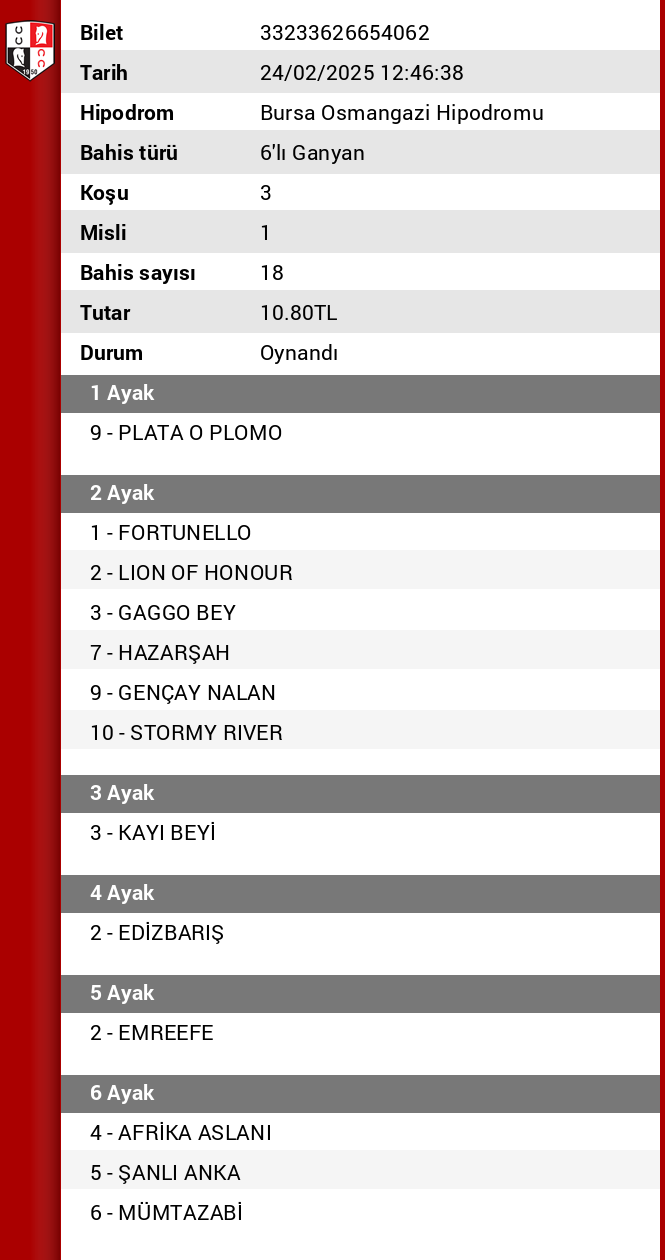 6.AYAK: 4 AFRİKA ASLANI’nın son yarışı çok başarılı. Uzayan mesafede tercübesi olmasa da uyumlu mesafede kazanmasını bekliyorum.