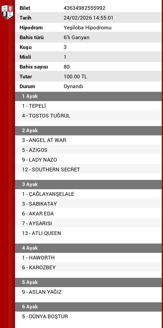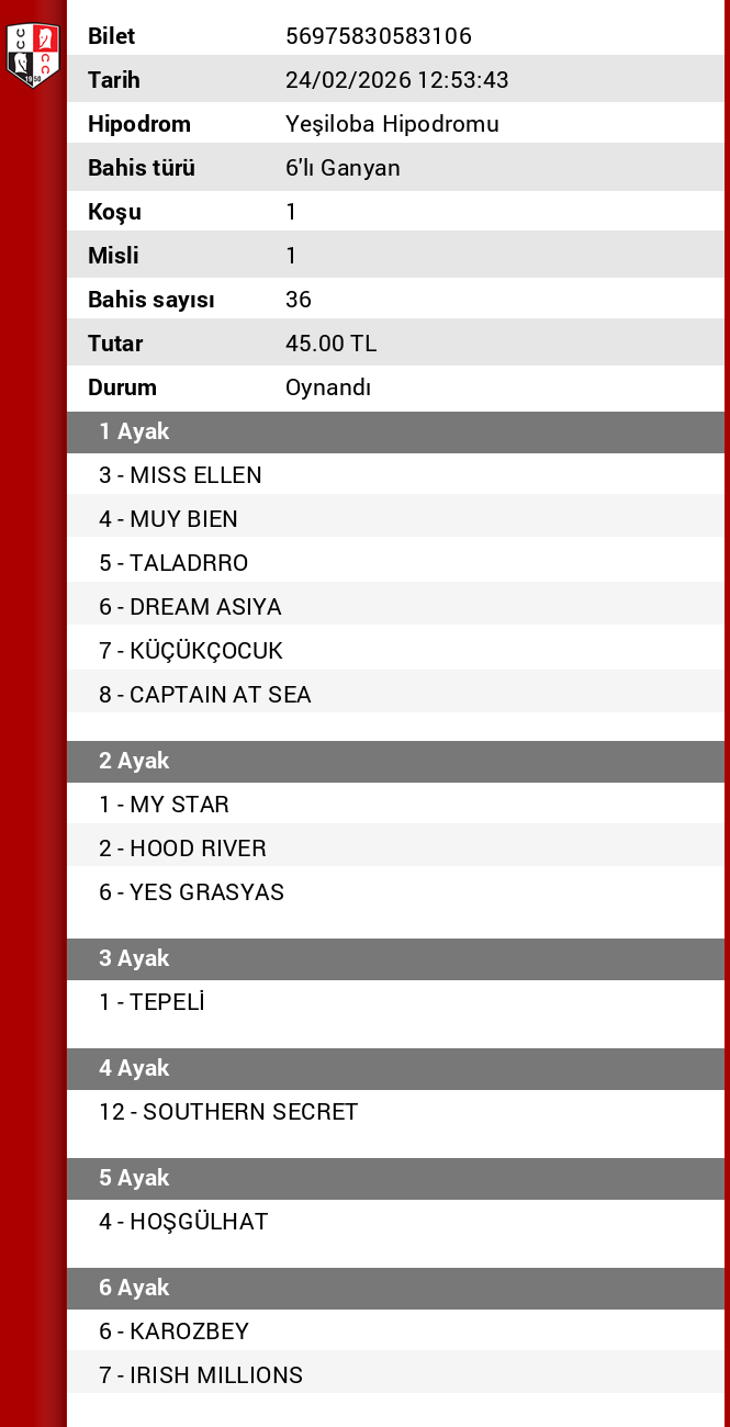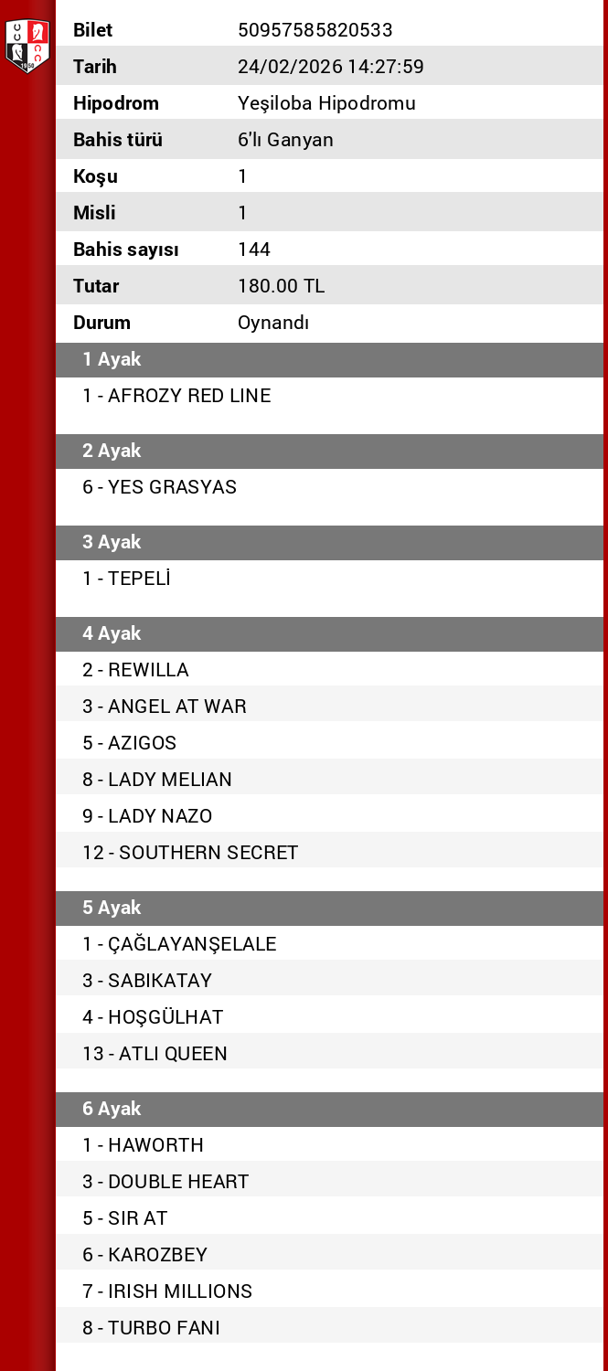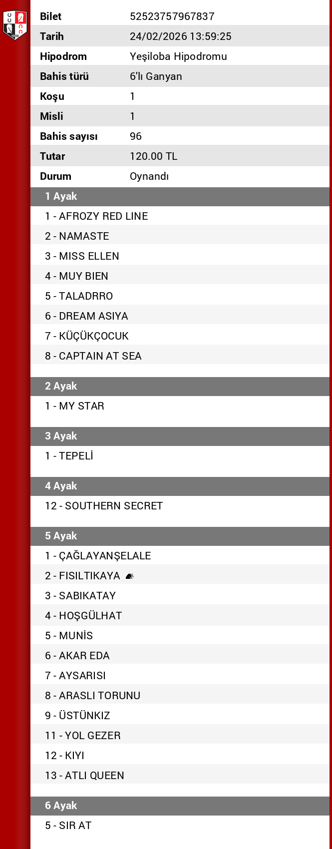 Bilet no 62379818596451 Bahis türü 6’lı Ganyan
