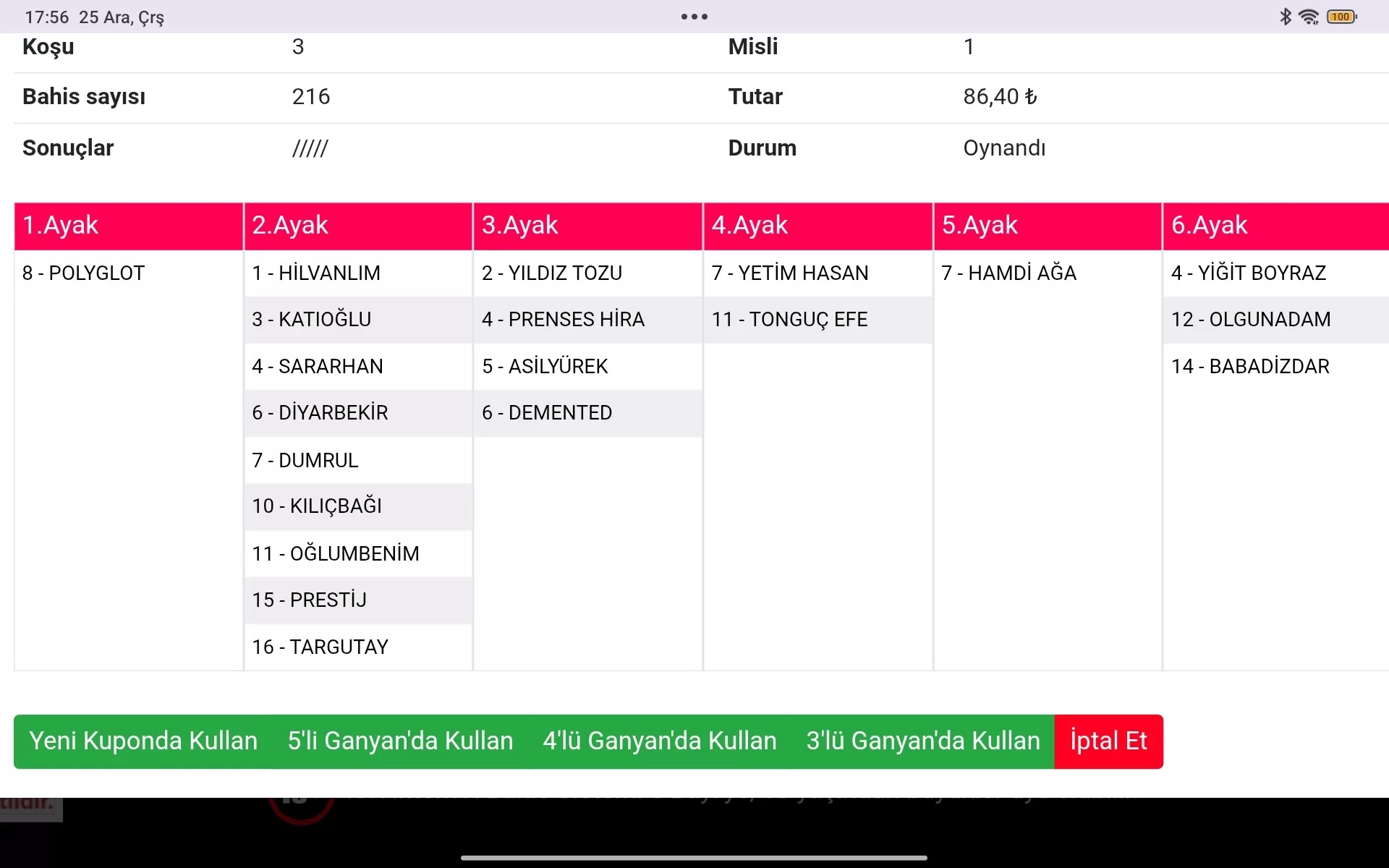 3.AYAK : 5 ASİLYÜREK son yarış iyiydi formda tekrar kazanabilir mi neden olmasın . 6 DEMENTED nerde ne zaman çıkacağı belli olmaz bugün de yaparsa şaşırmam 4 PRENSES HİRA hızlı gidecek bir yarışta şanslı olur gibi 1 TURDEMİRKIR kendini toplamaya çalışıyor belli olmaz buranın atı değil zaten güç toplayıp gidecektir. 2 YILDIZTOZU iyi yarışları var bugün şanslı isimlerden 3 GOSPODIN geniş kuponlara eklemek normal olur.