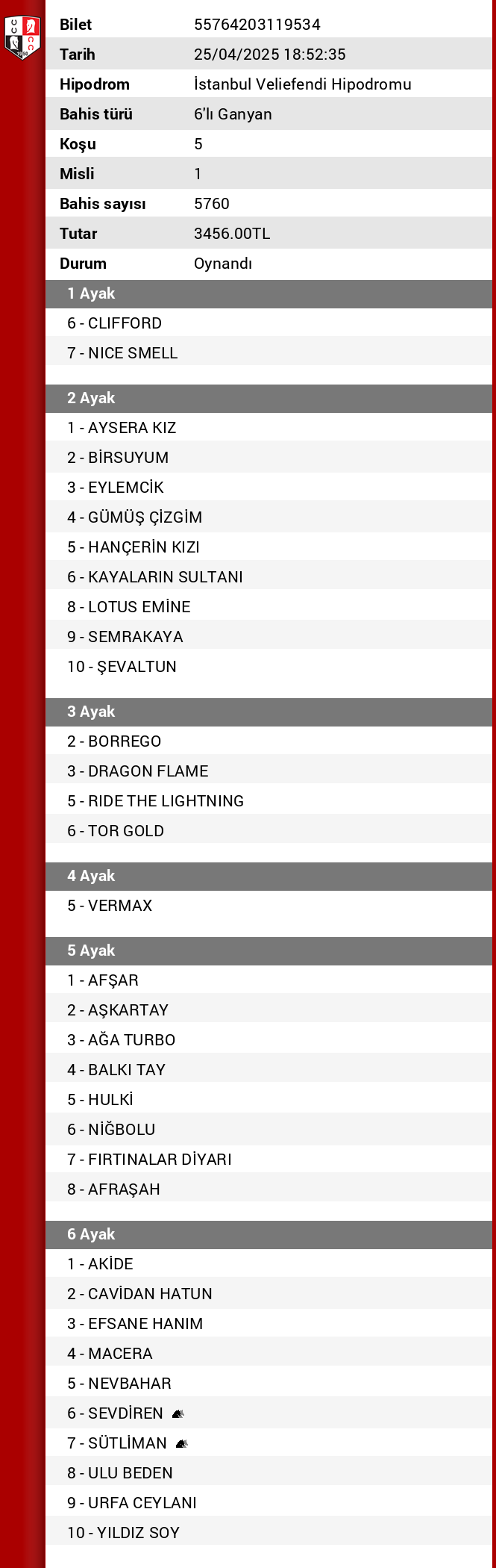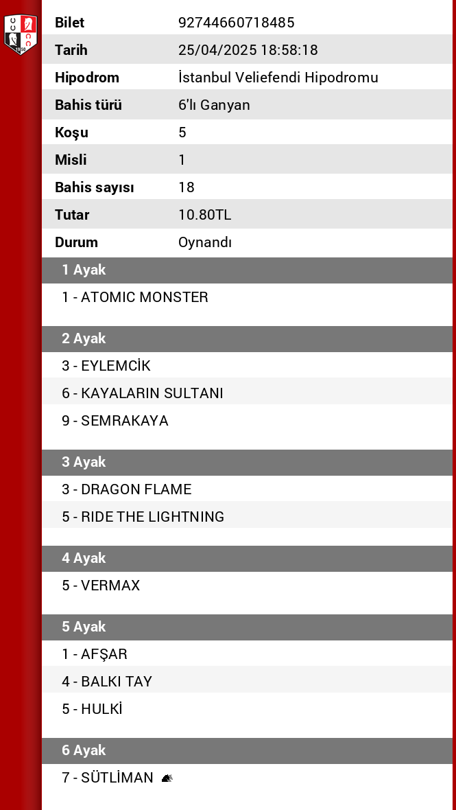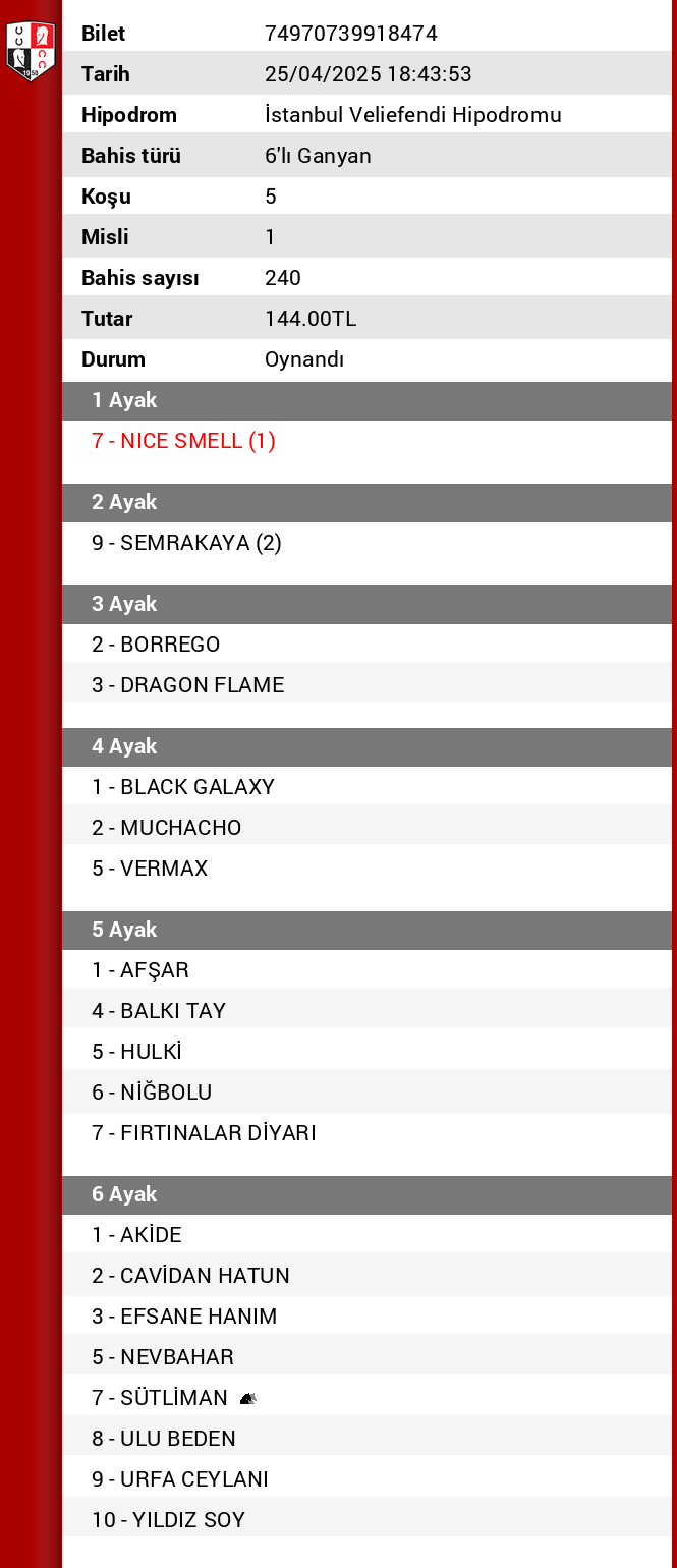 Bahis sayısı 240 Tutar 144,00 ₺