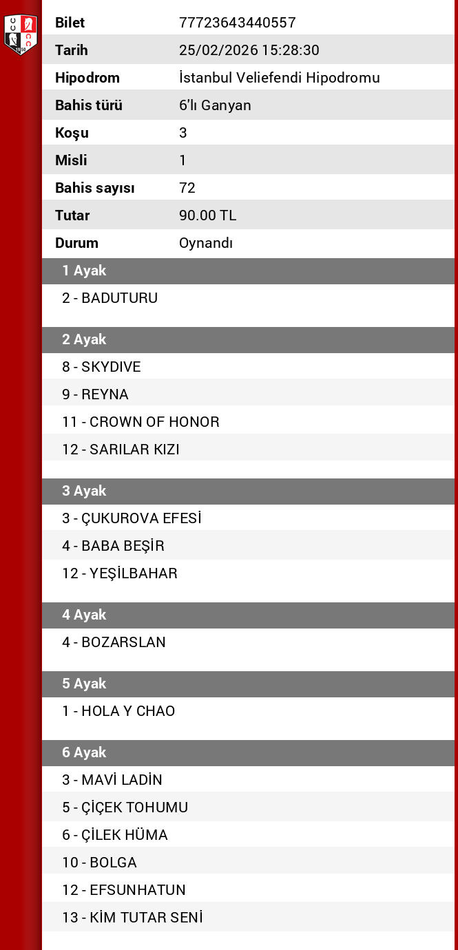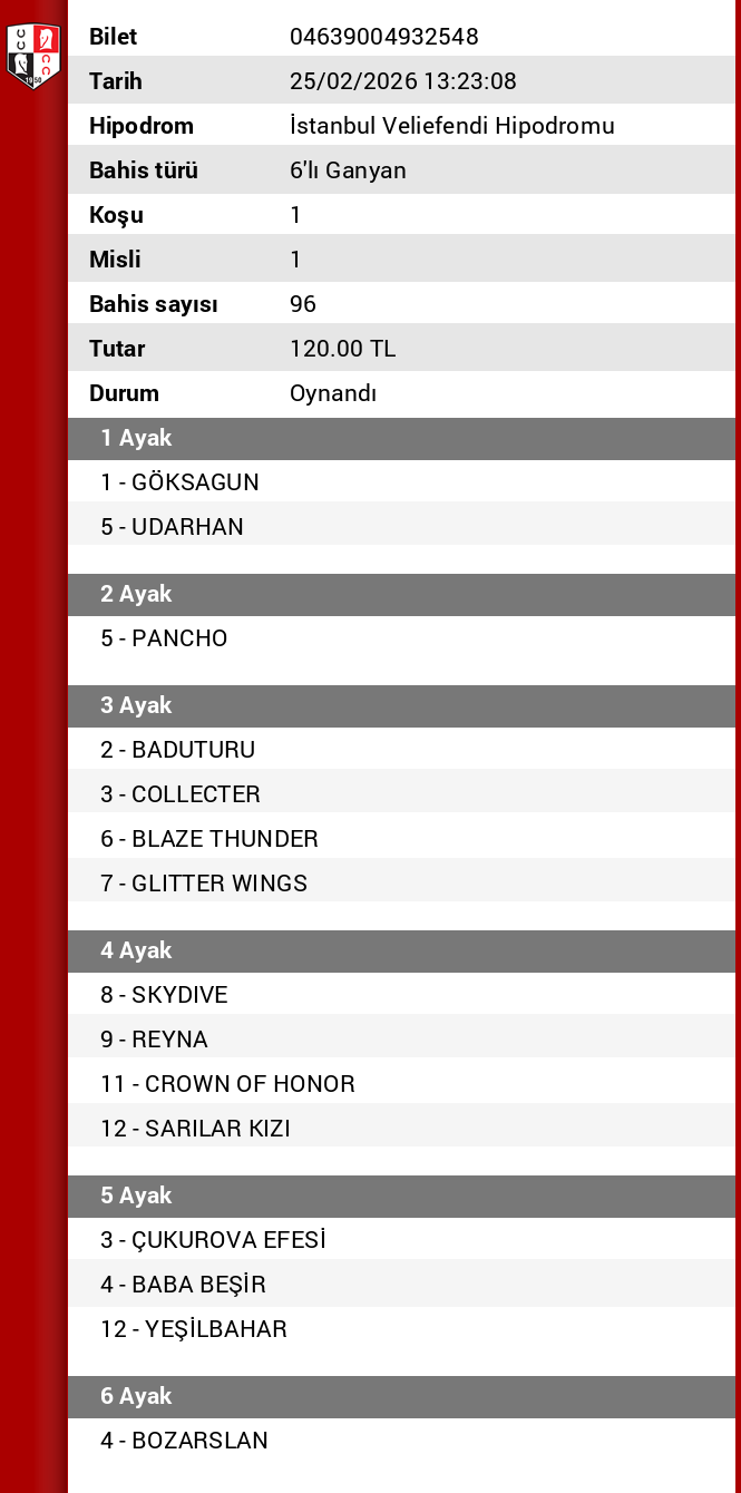 Bilet no 95660213212383 Bahis türü 6’lı Ganyan