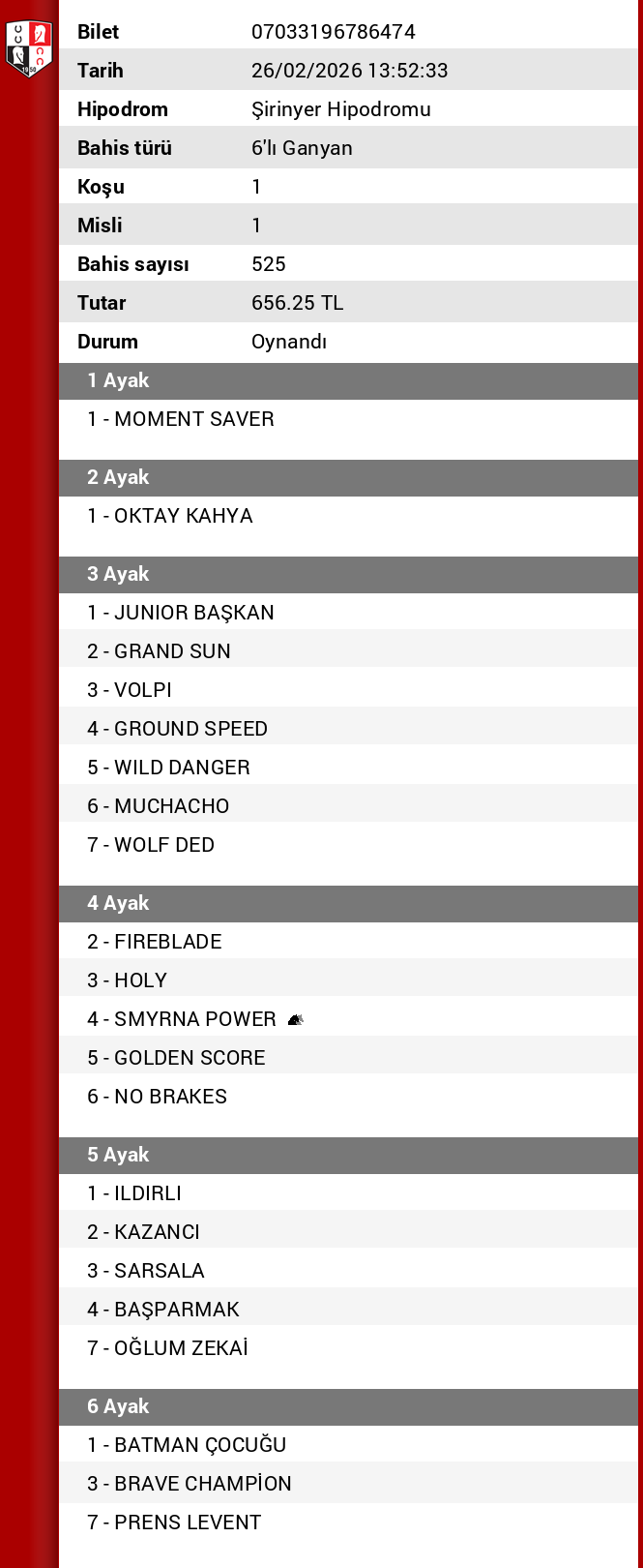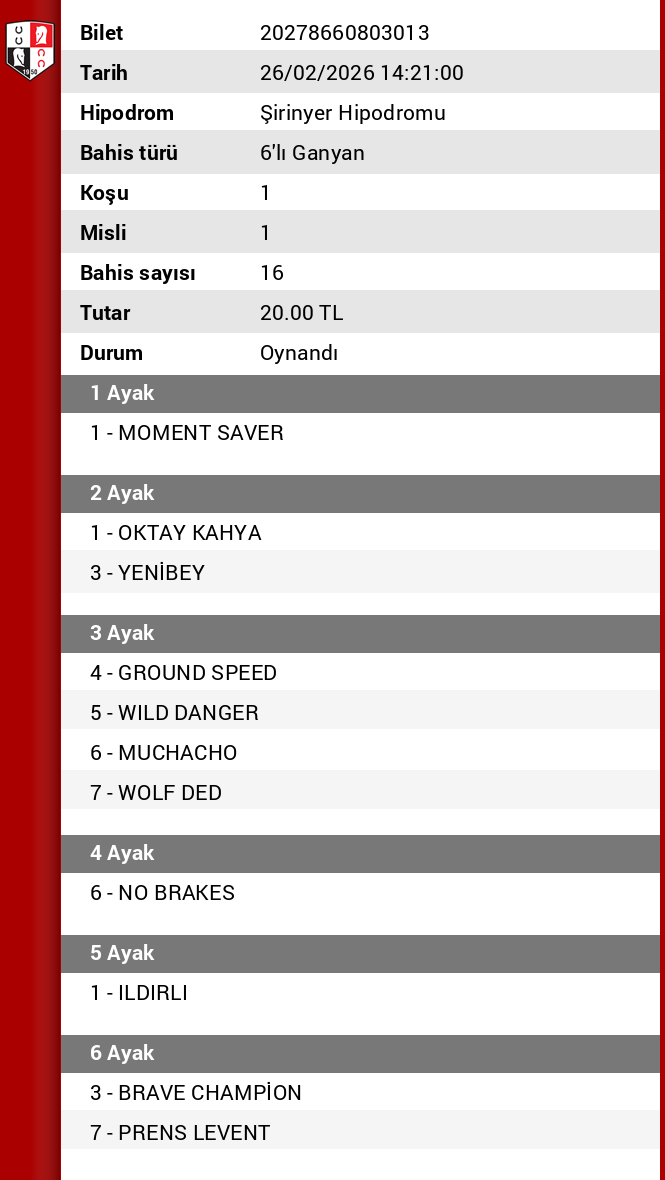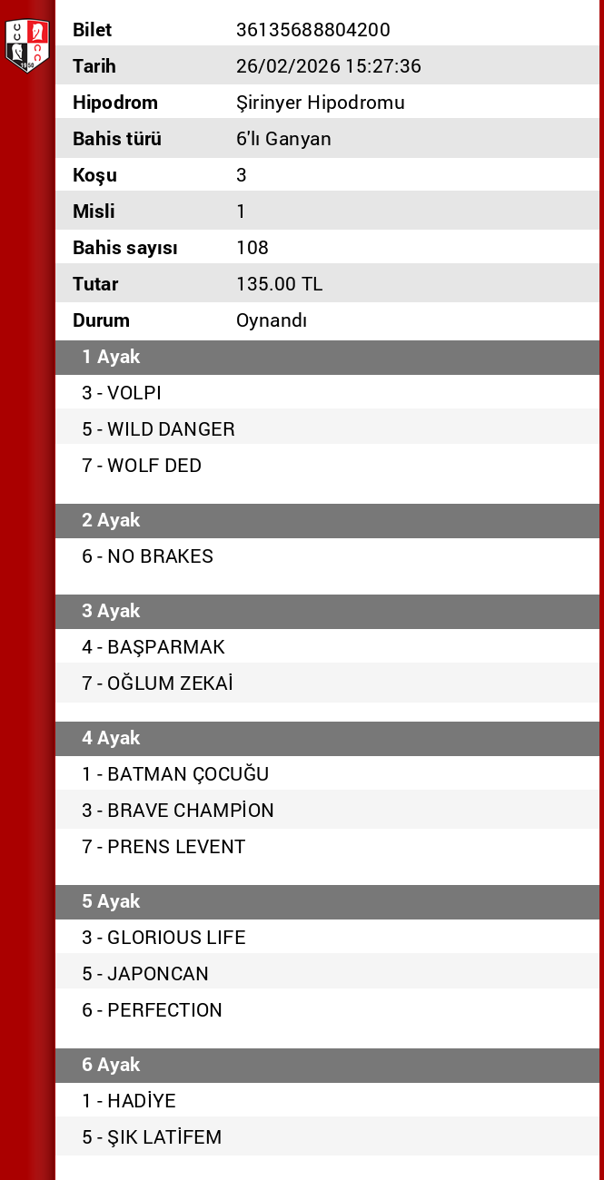 Bilet no 59716200807592 Bahis türü 6’lı Ganyan