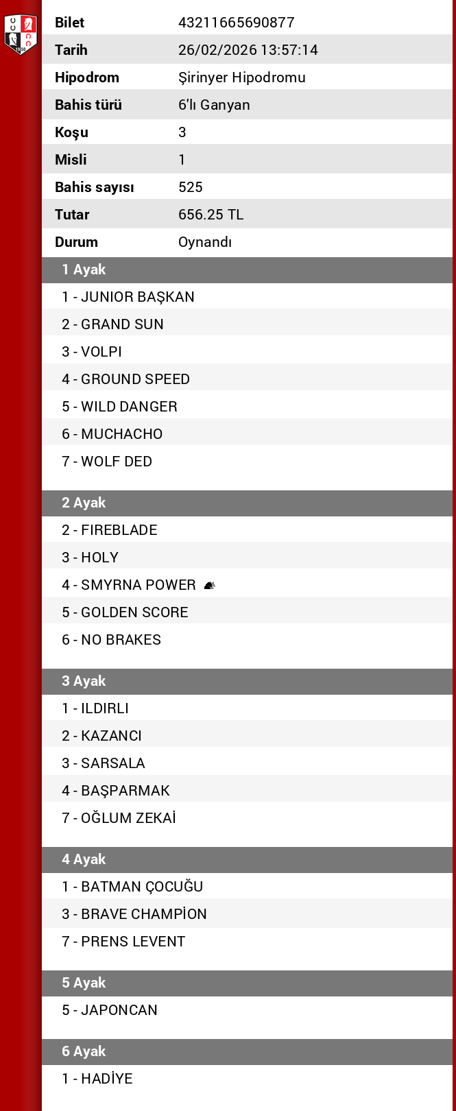 Bilet no 60725483395775 Bahis türü 5’li Ganyan