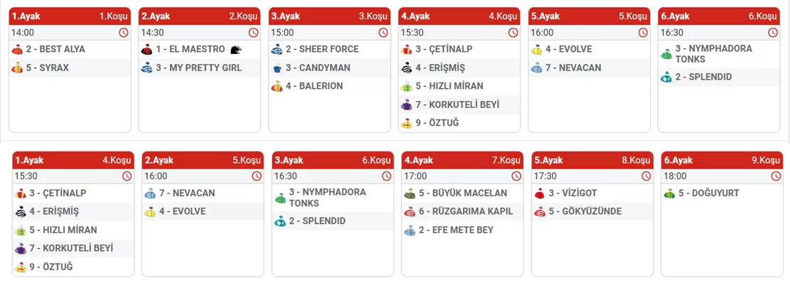 4.AYAK: 6 KİNG VOLKAN ilk yarışına göre en iyi isim. 1 AKGÜN AĞA rakibi. 3 ÇETİNALP ilk koşusunda tempoya uyamadı. Şimdi DB takılmış Kocakaya yine üstünde. 7 KORKUTELİ BEYİ işleri çok iyi. 5 HIZLI MİRAN’ın Urfa yarışı fena değil. 2 ÇELİK TOYNAK diğer ihtimal.