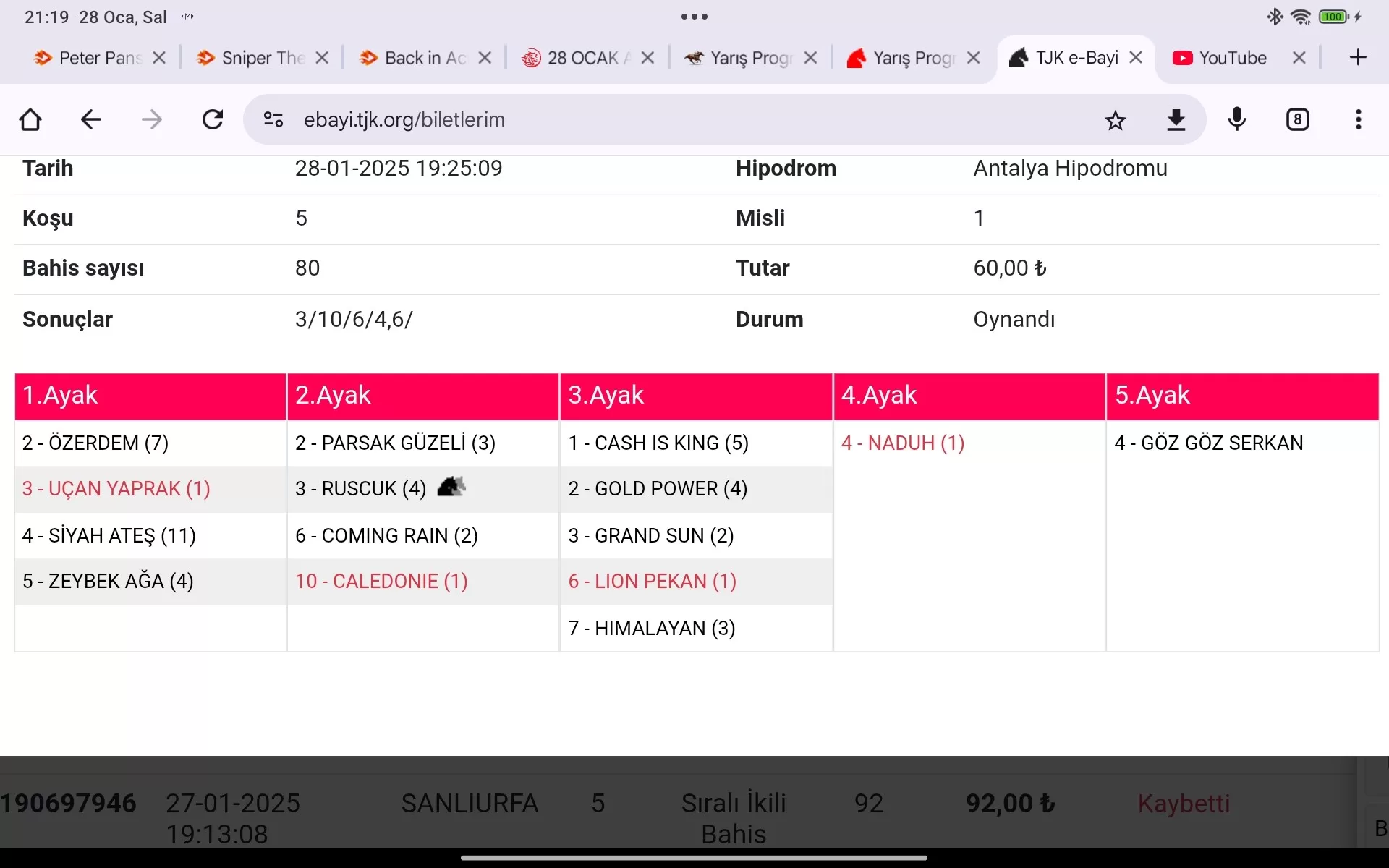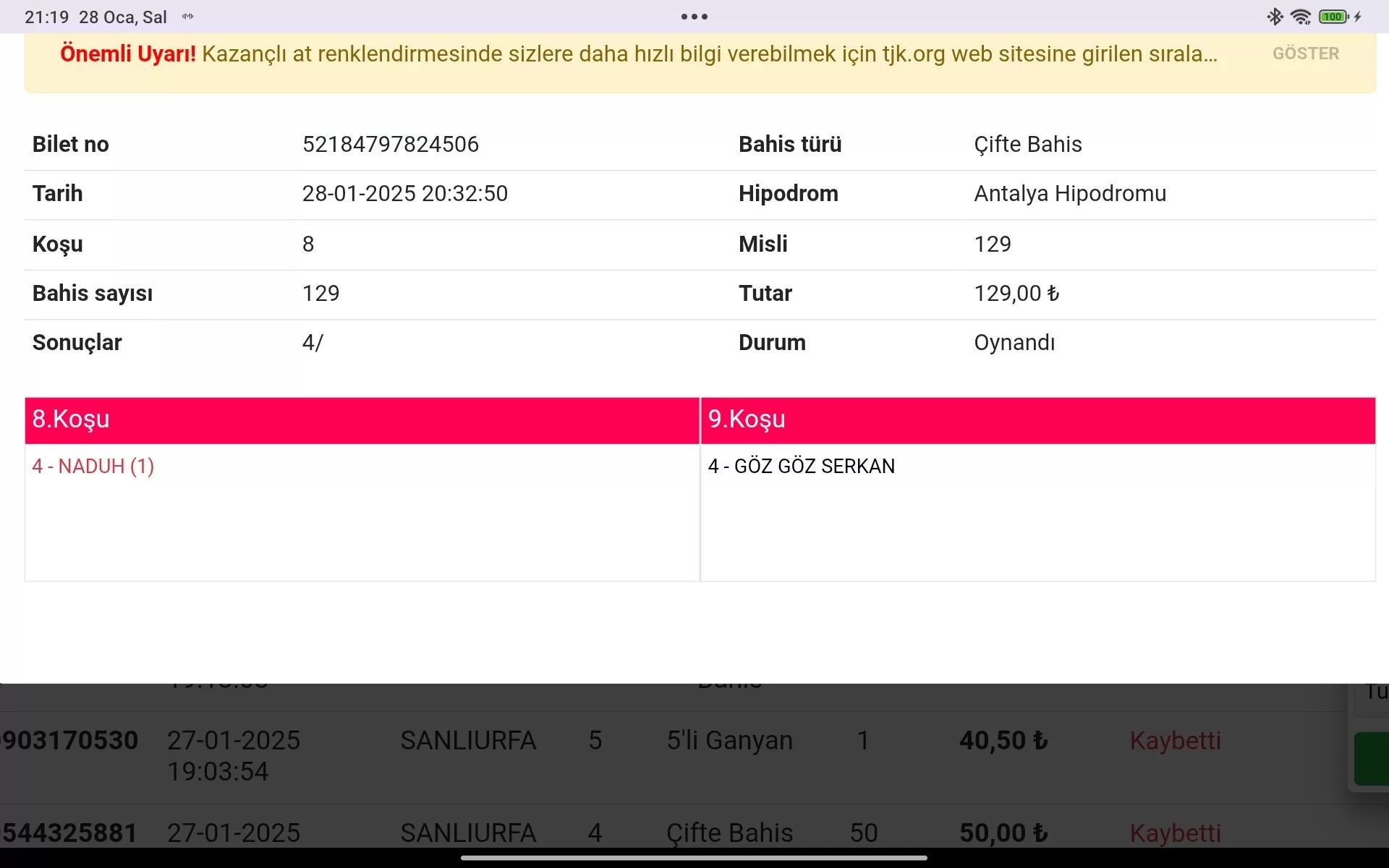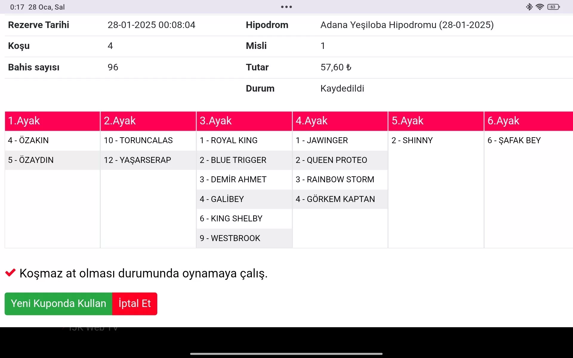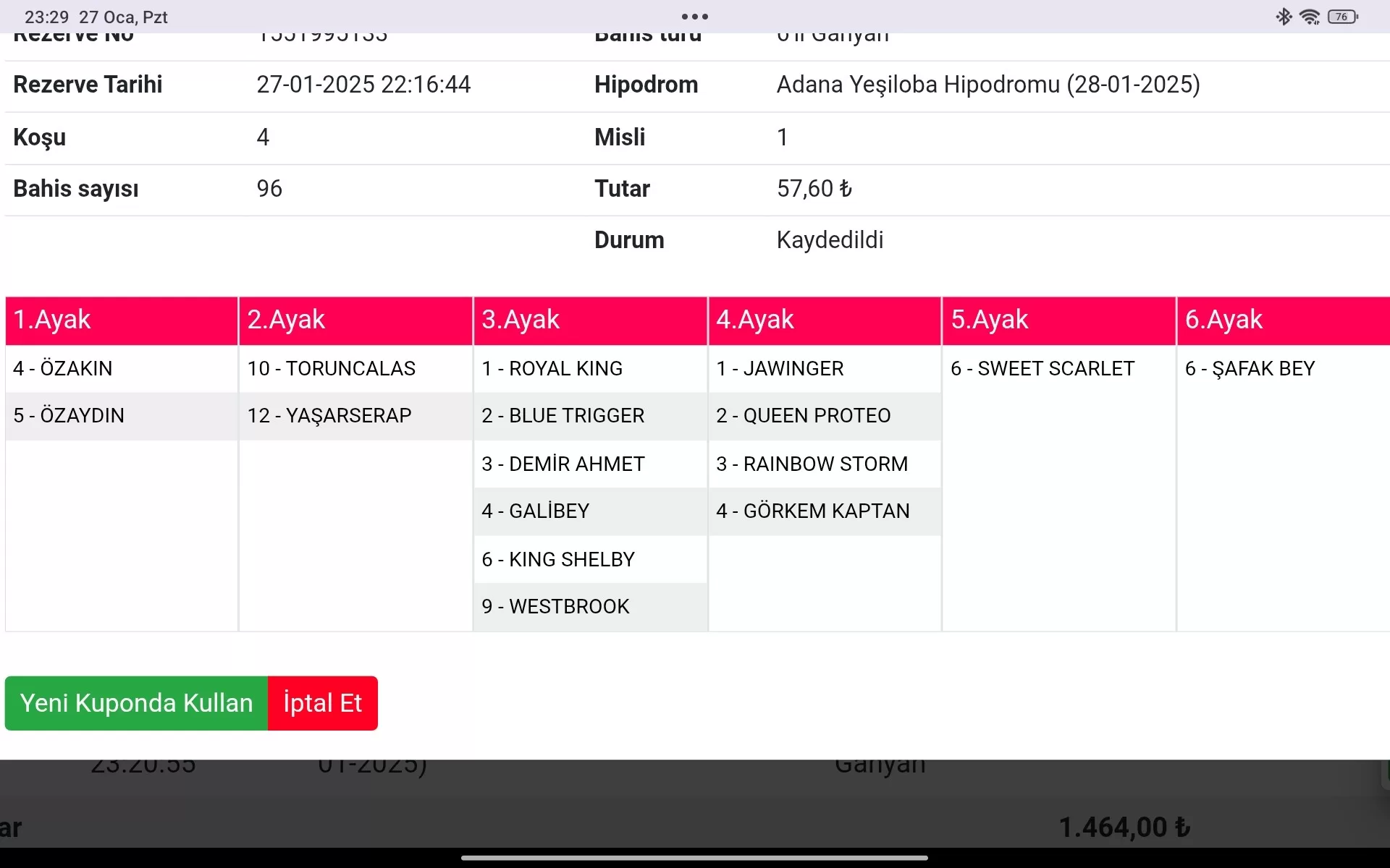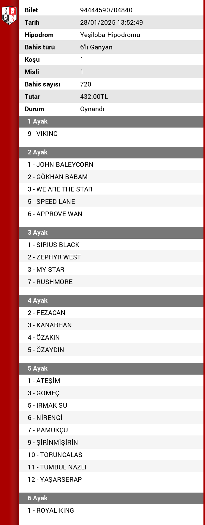 Bilet no 65951246693506 Bahis türü 6’lı Ganyan
