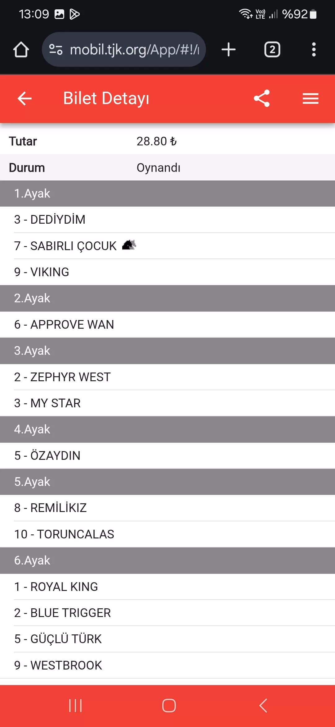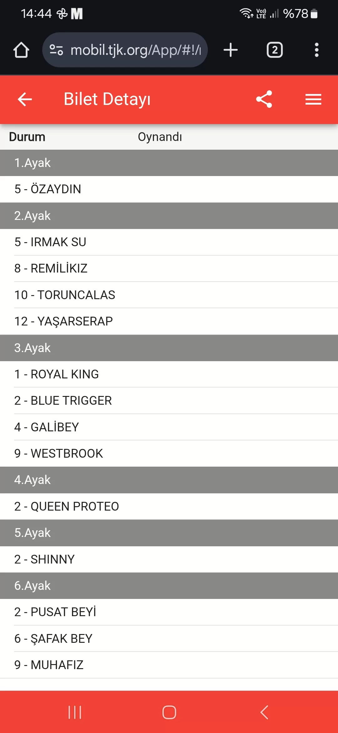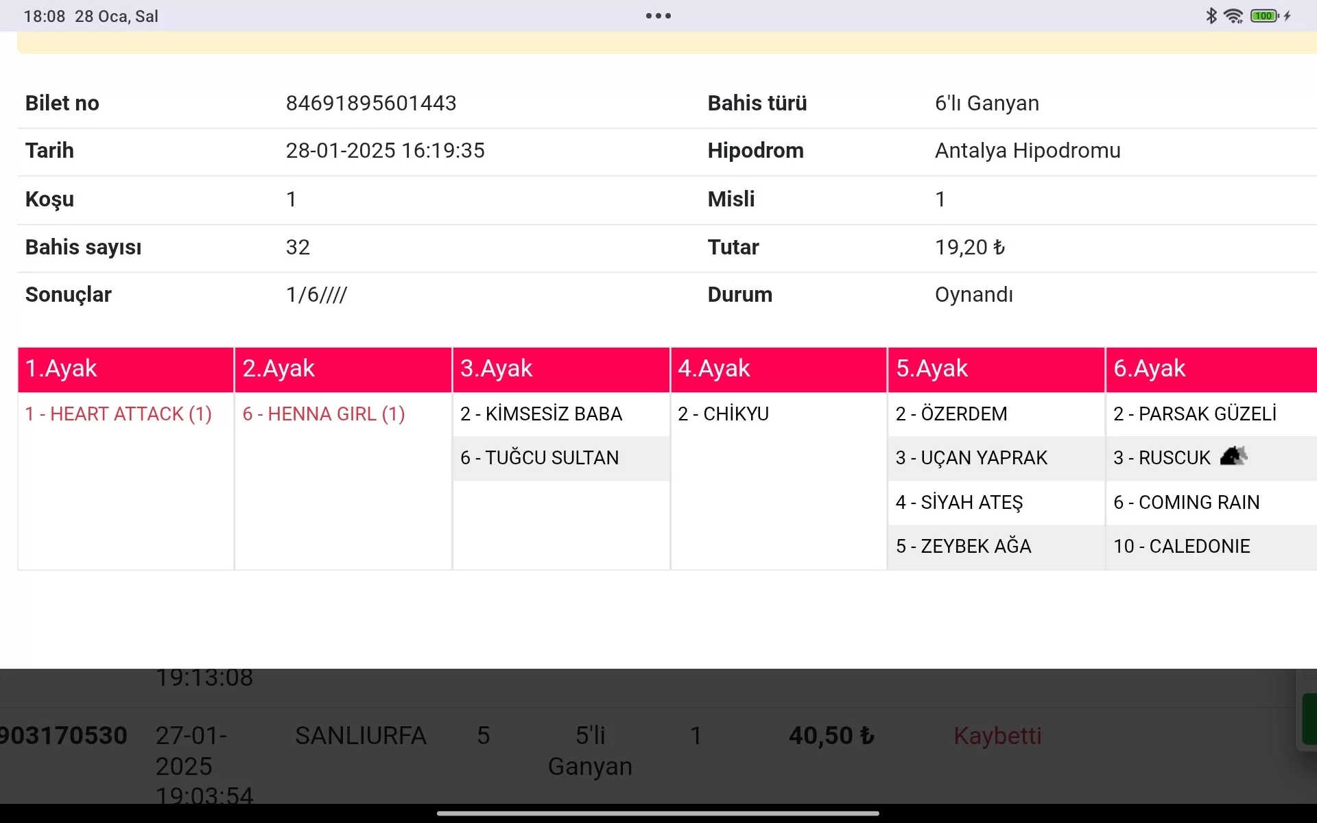 Bilet no 16539082026632 Bahis türü 6’lı Ganyan
