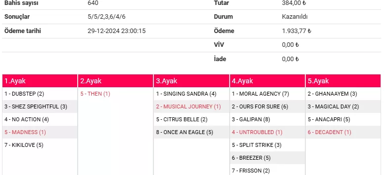 Hatta ilk altılıyı oynayamayınca oynayamadım ama 5liye 4 at yazdım