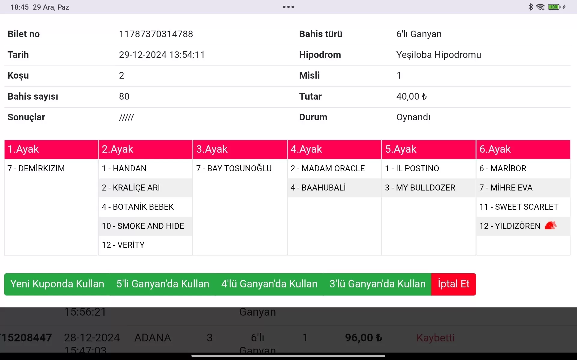 İkinci ayak 6, üçüncü ayak 8 tek, 4 ayak H oynayacaktım. 6 yarıştan çıktı ikinci ayağı H yapıp ilk ve 4. ayaktan kıstım, şablon da hazırladım buraya atmaya. Kuponu yatırıyordum çim iptal olmuş. Sentetikte ne olur derken 6lı yetişmedi, 5li oynadım